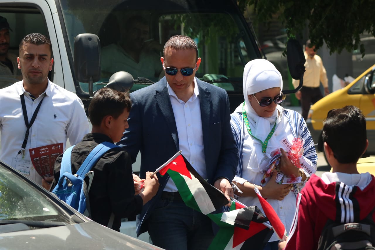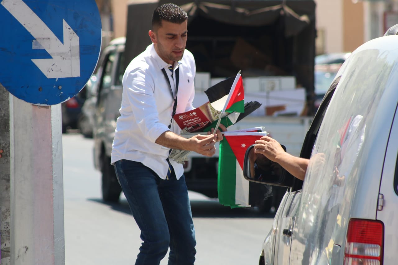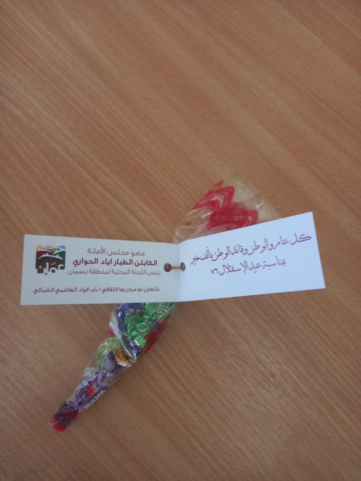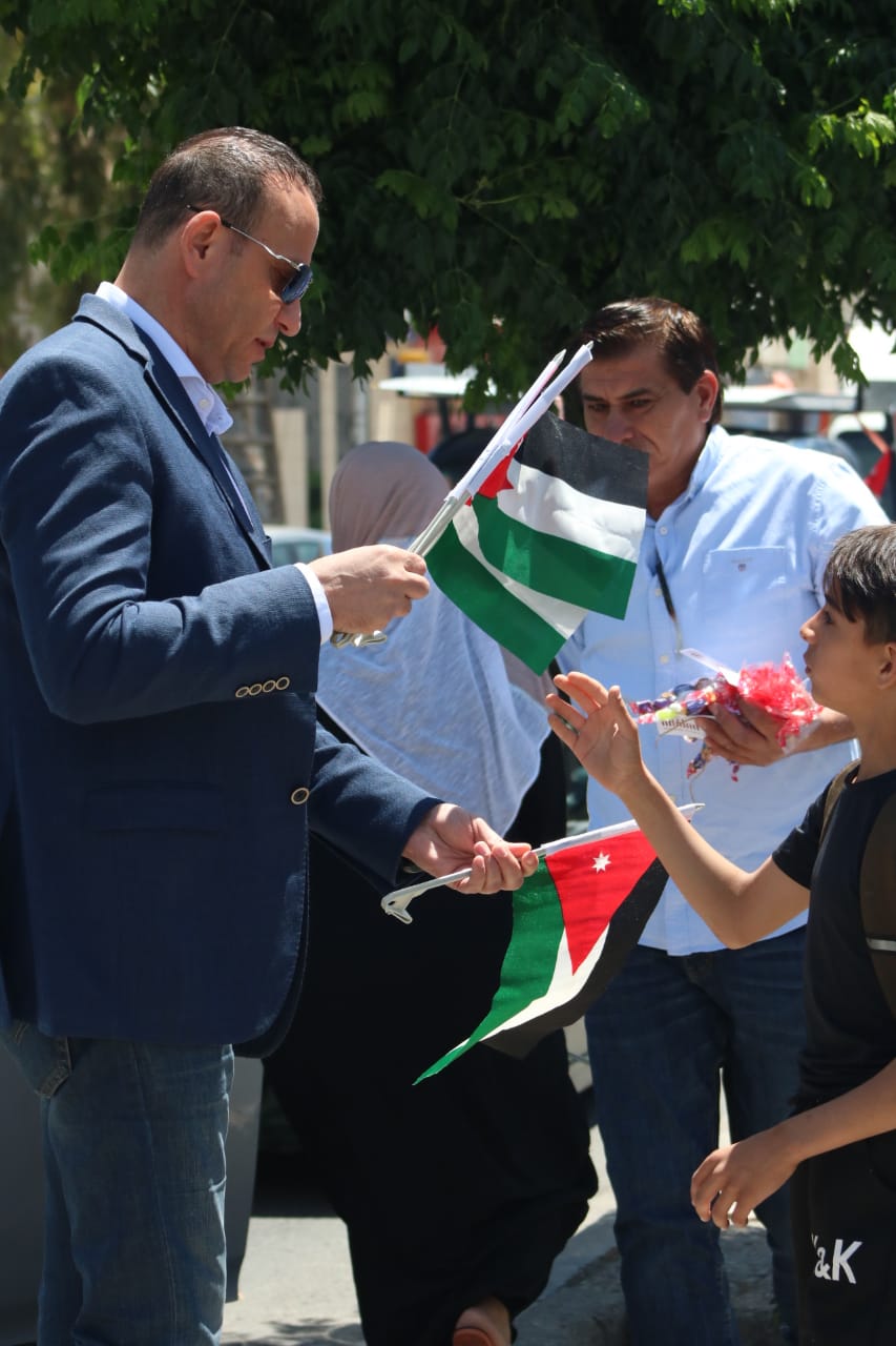 عمون - برعاية رئيس اللجنة المحلية لمنطقة بسمان الكابتن الطيار إياد الحواري عضو مجلس أمانة عمان الكبرى، تم توزيع الأعلام وبطاقات المعايدة على المواطنين بمناسبة عيد الاستقلال. |