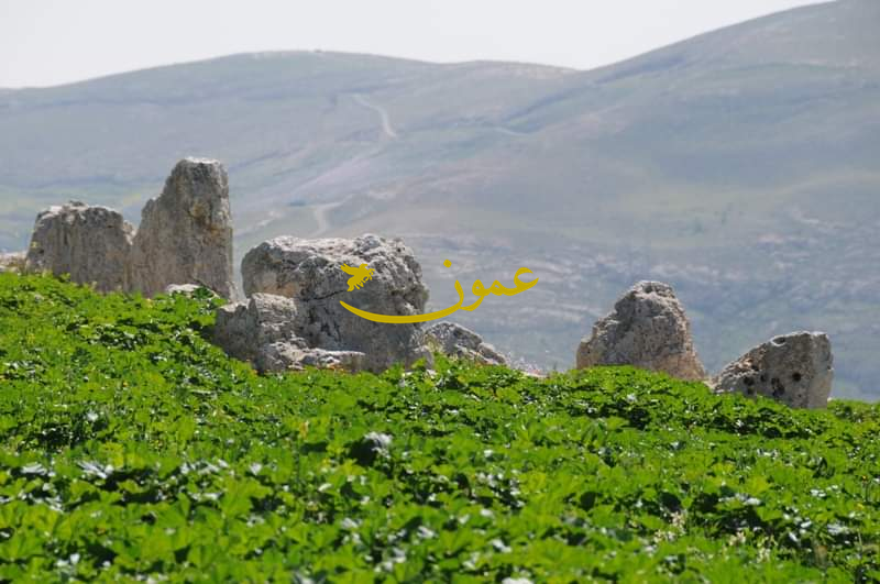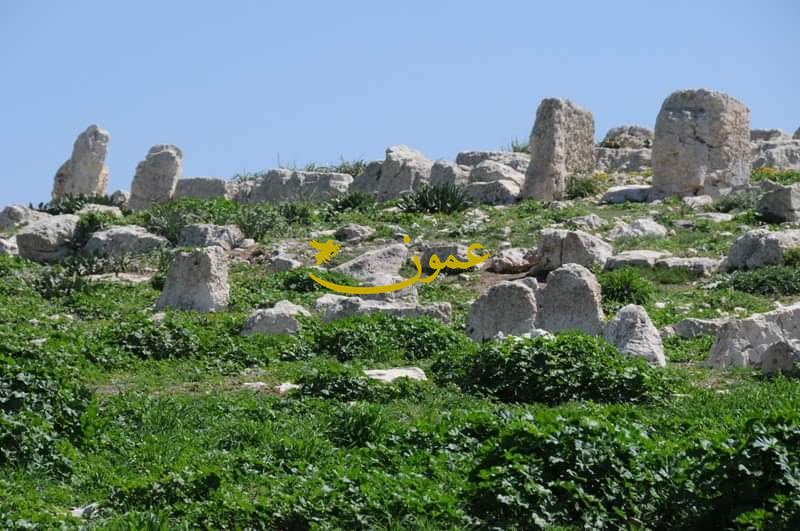 أخذنا جولتنا ضمن مساحة الأنصاب الحجرية والتي ذكرها الضابط البريطاني كونراد في فصلِ كامل ضمن كتابه "كتابة المسوحات الأثرية في شرق الأردن وفلسطين"، أما الذي حولها فهو جدار صخري يحيط بالموقع وشبكة من القنوات المائية، إضافةً لبئر قديم منقوب بالصخر والذي ما زال يستخدمه الأهالي لغاية اليوم، وسلسلة من الجرون متعددة الاستخدام كالواسعة لتجميع مياه الأمطار، والملساء لطحن الحبوب، أو لغايات جنائزية كإشعال النار أو الذبح عليها وجمع دماء القرابين، ومن الموقع اجتزنا مكان السيل القديم نحو التل والذي يبدوا أنه كان جارياً من نعومة رواسبه.