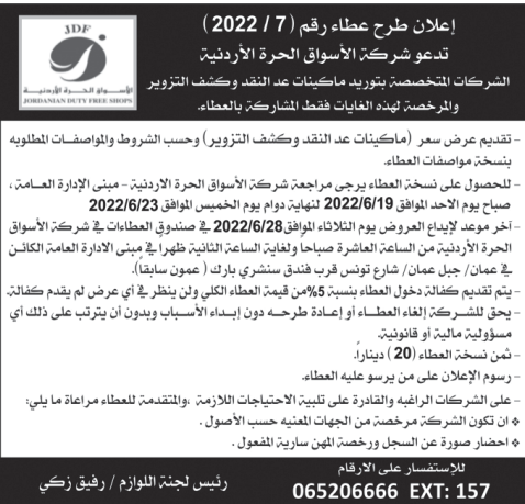عطاء صادر عن الاسواق الحرة الاردنية
