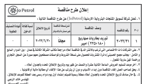 عطاء صادر عن شركة تسويق المنتجات البترولية "Jopetrol"