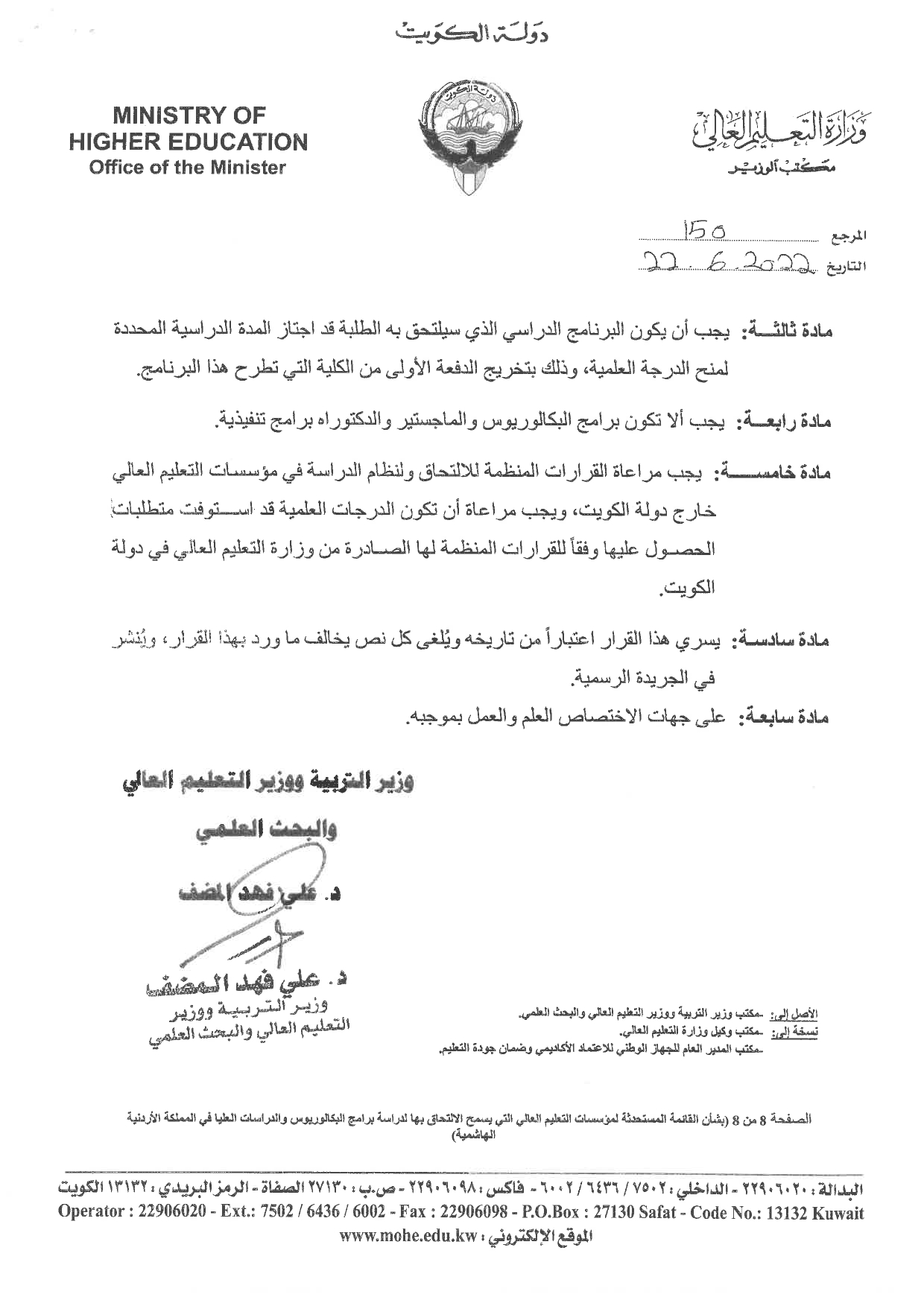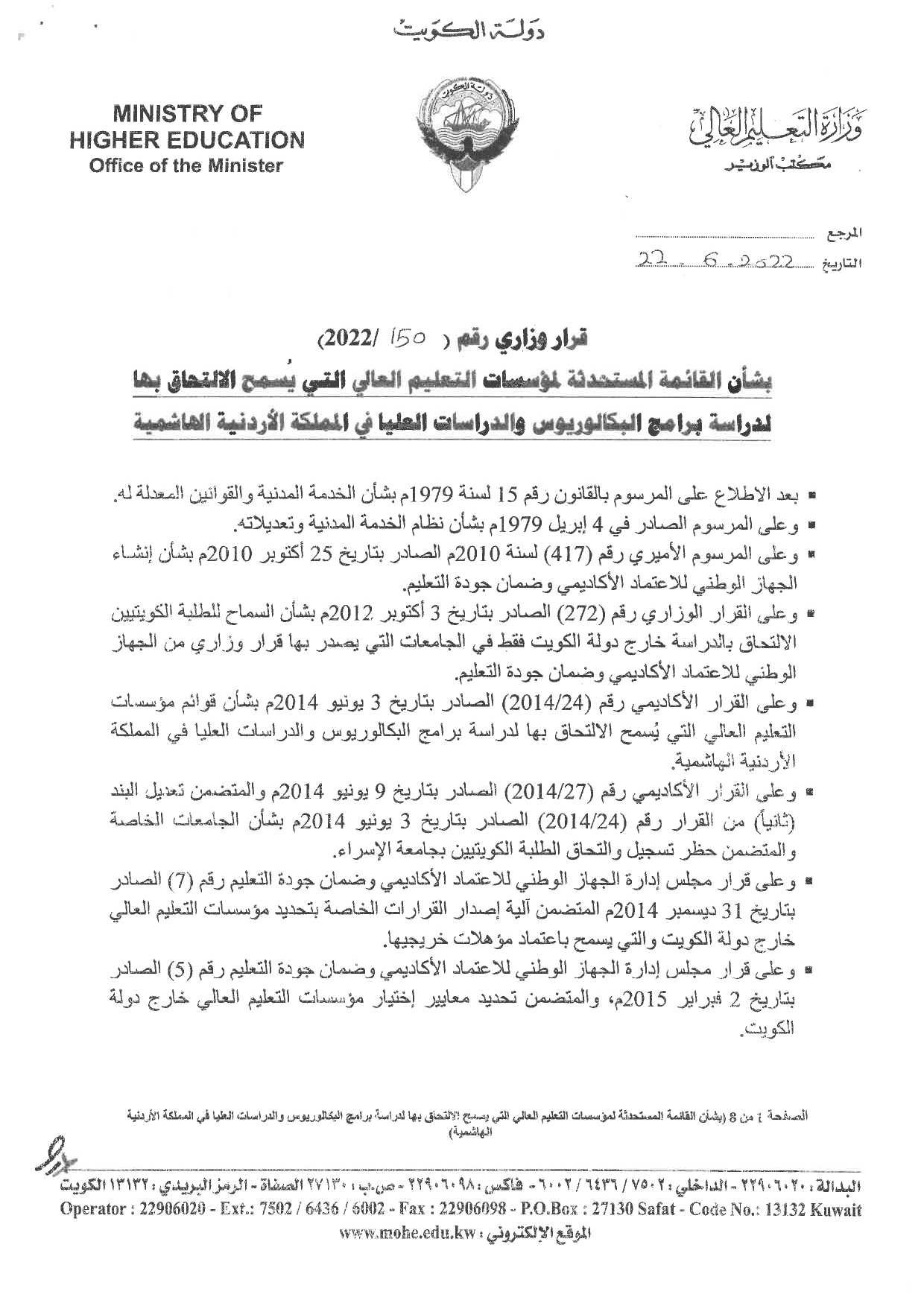 عمون - قررت وزارة التعليم العالي في دولة الكويت، اليوم الاربعاء، سحب اعتماد برنامج الدكتوراة في تخصص العلوم السياسية بالجامعة الاردنية اعتبار من تاريخ اليوم. |