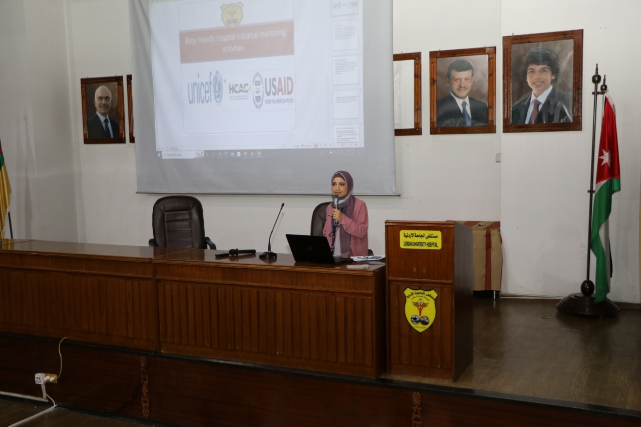 بدورها قدّمت ممثل مكتب الجودة السيدة لبنى الأحمد شرحاً حول نظام مراقبة مؤشرات الرضاعة الطبيعية الذي يقوم به المكتب، مؤكدة على ضرورة الالتزام بتطبيق (10) خطوات للرضاعة الطبيعية الناجحة لقياس دعم الرضاعة الطبيعية المقدم من المستشفيات وممارسات تغذية الأمهات، مبيّنةً بأن المستشفى ممثلاً بمكتب الجودة وبالتعاون مع الكادر التمريضي في الاقسام المعنية بالعناية بالام والطفل بتوزيع استمارة للأمهات قبل الولادة وبعدها تشمل مجموعة من المؤشرات التي تُبيّن مدى الدعم المقدم لهم من قبل المستشفى ومقدمي الخدمة .