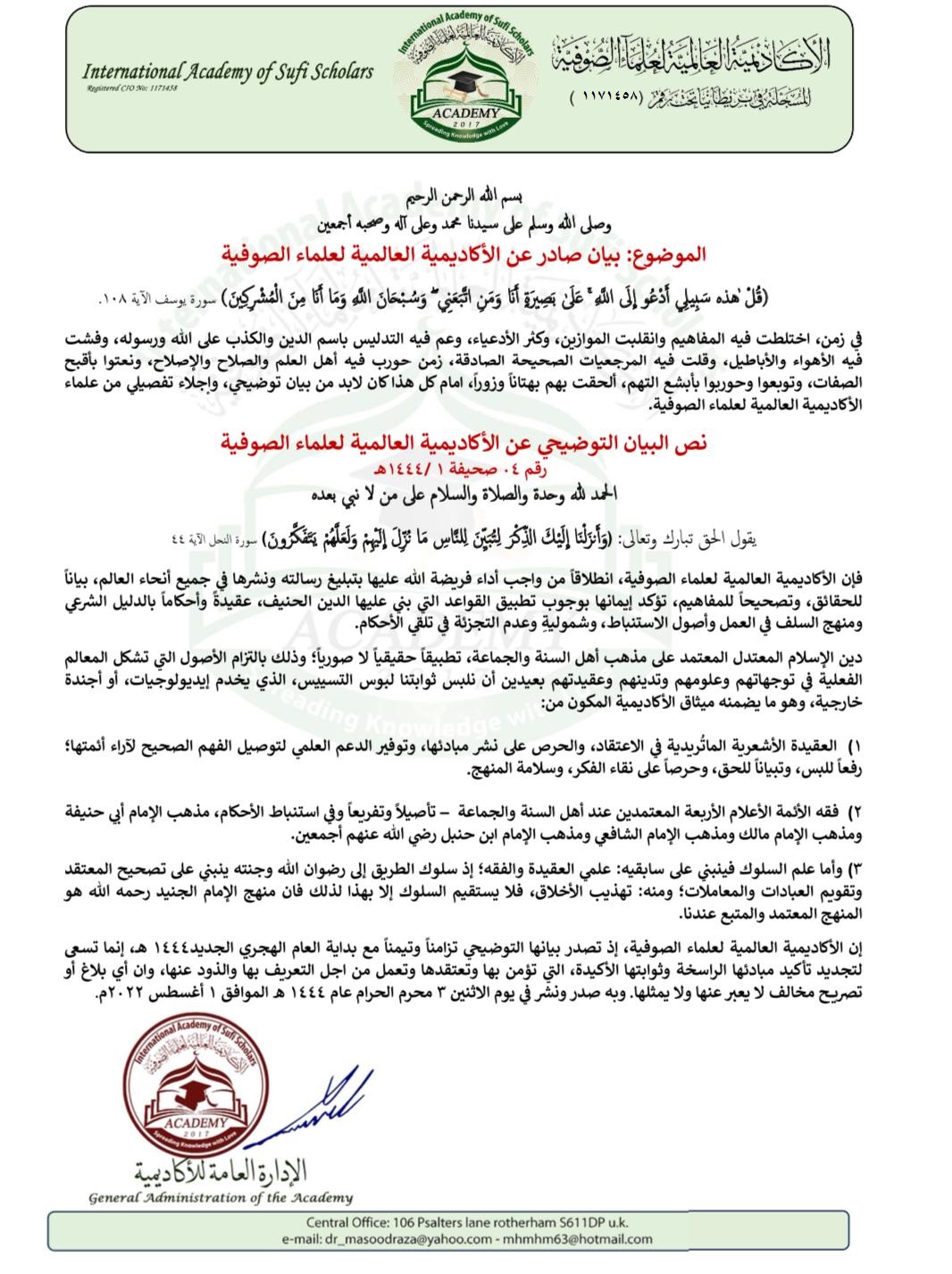 وأشارت الأكاديمية إلى أن اصدارها لهذا البيان يأتي في إطار أداءها فريضة الله عليها بتبليغ رسالته ونشرها في جميع أنحاء العالم، وتزامناً مع بداية العام الهجري الجديد1444 هــ، مضيفة انها تروم تجديد تأكيد مبادئها الراسخة وثوابتها التي تؤمن بها وتعتقدها وتعمل من اجل التعريف بها والذود عنها، وان أي بلاغ أو تصريح مخالف لا يعبر عنها ولا يمثلها.
