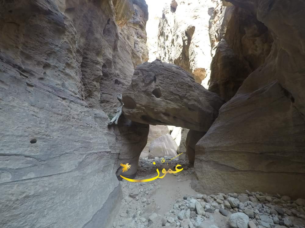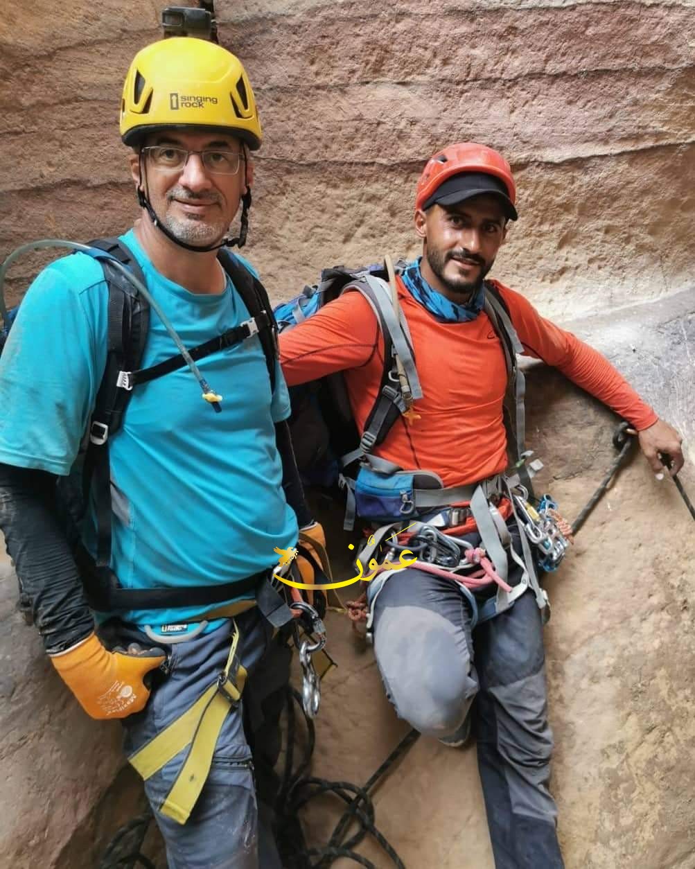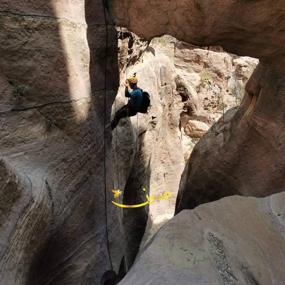 فما إن تجتاز بعض المساقط والانزلات حتى يخيم صمت رهيب على المكان فلا يسمع فيه إلا صوت خشخشة أحذيتنا العريضة ذو الكعب، واهتزازات مرابط وحلاقات التعلق كالأجراس أثناء المسير، متناوبين على حمل الحبال والمعدات من موقعٍ إلى آخر دون تباعد، ويد العون والمساعدة بيننا مع كل فج ضيق يتطلب اجتيازه بين صخور قد علقت بين كتفي الجبل وتوجب النزول عنها بشكل عامودي والاستمتاع بهذه الهندسة الفطرية التي قل نظيرها، وغيرها العديد مما مررنا من أسفله بارتفاعات مختلفة بعضها كان بعلو قامة ومنها ما زاد عن الخمسين متر بأحجام مختلفة.