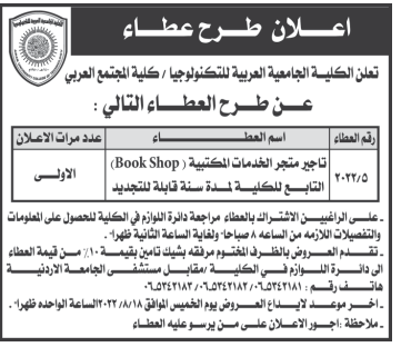 عطاء صادر عن الكلية الجامعية العربية للتكنولوجيا