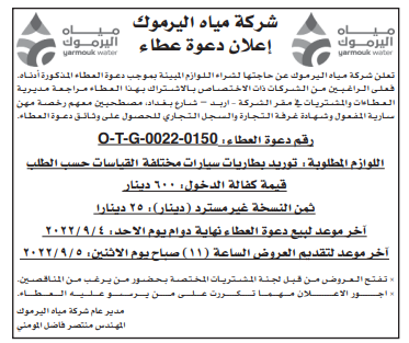 مطلوب توريد بطاريات سيارات لشركة مياه اليرموك