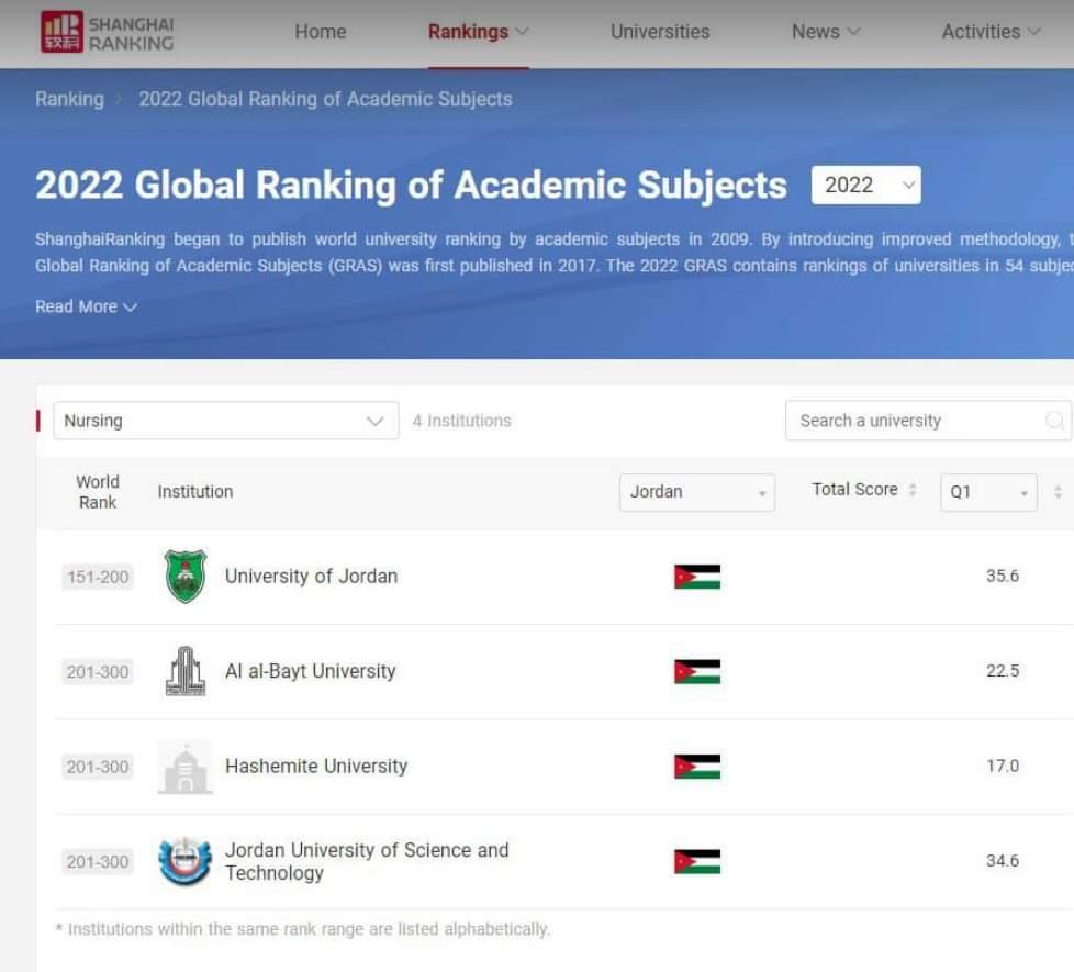 عمون - أُدرج تخصص التمريض في الجامعة الهاشمية، ولأول مره في تصنيـــف شنغهاي Shanghai العالمـي من خلال (Global Ranking of Academic Subjects) محتلاً الفئة (201-300) عالمياً وفي الترتيب الثاني محلياً للعام 2022؛ جاء ذلك تتويجاً للجهود التي تبذلها إدارة الجامعة في تعزيز ثقافة النشر العلمي في المجلات العلمية العالمية ودعم الباحثين، وتعزيز مكانة الجامعة على المستوى الدولي.