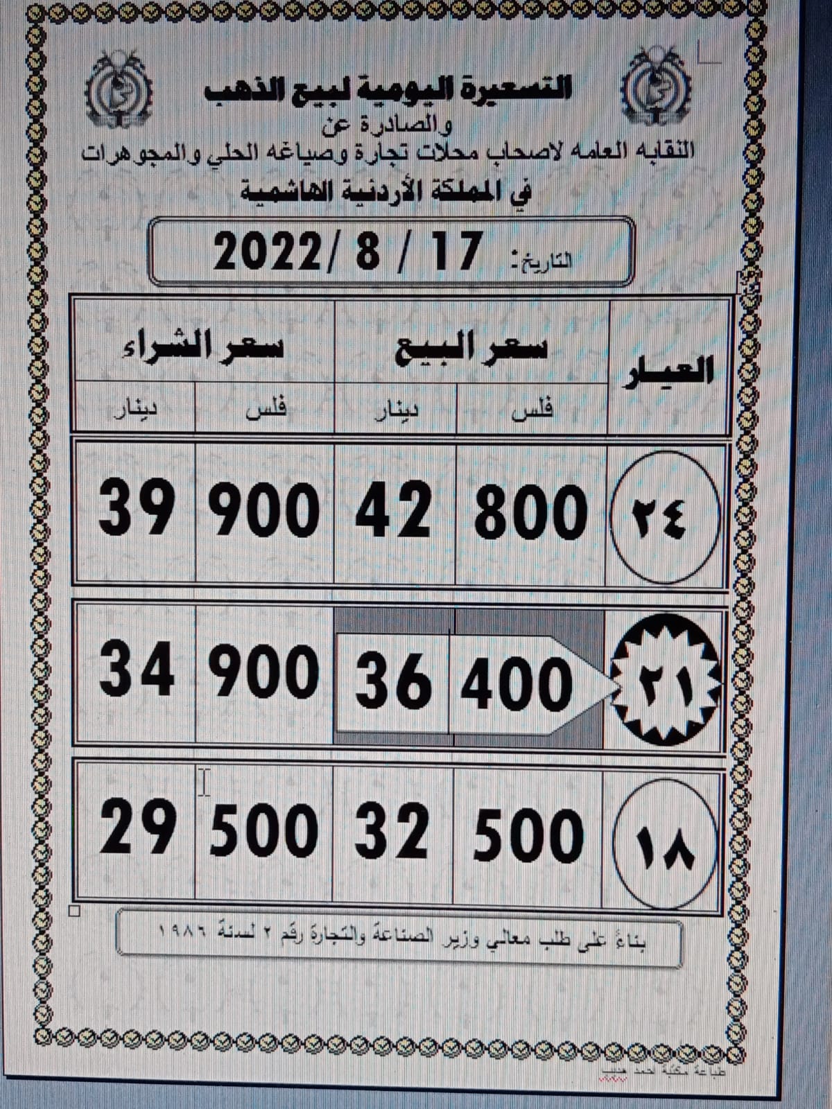 أسعار الذهب في الأردن الأربعاء17-08-2022 10:55 AM