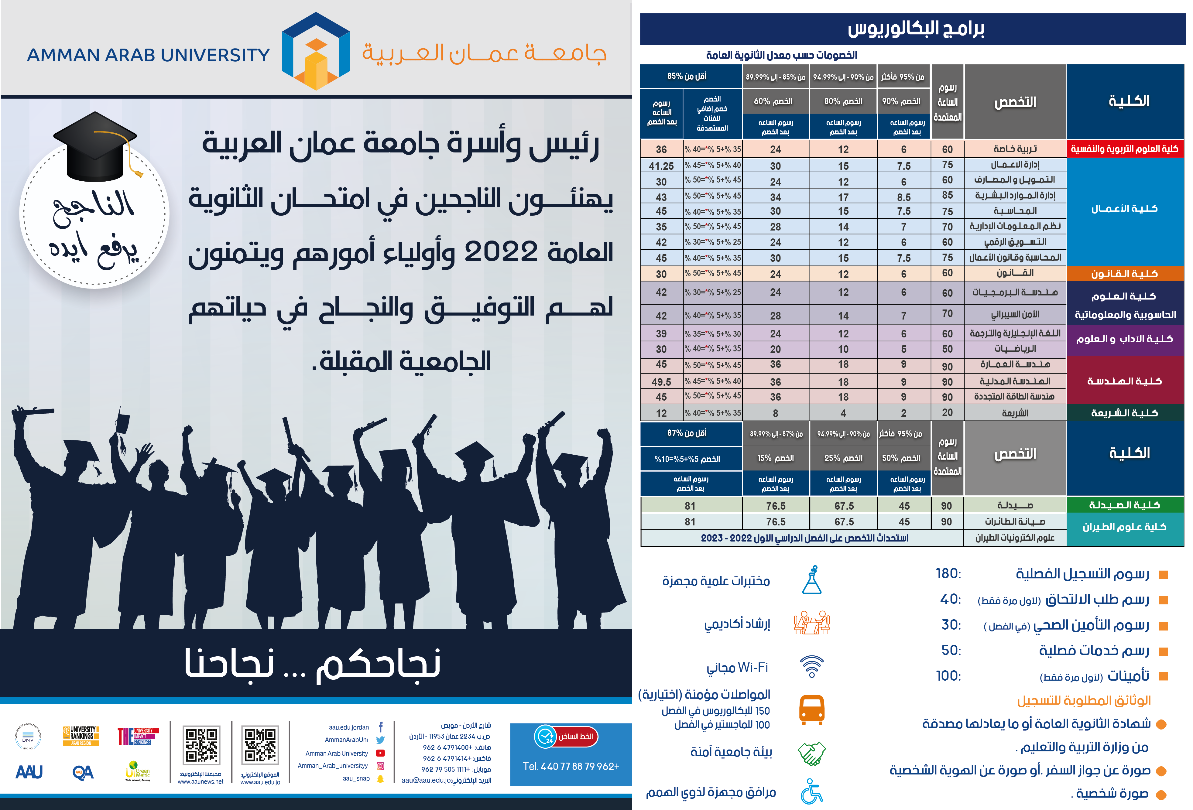 ولمزيد من المعلومات يرجى الدخول للموقع الالكتروني للجامعة وصفحاتها على مواقع التواصل الاجتماعي من خلال الرابط التالي: https://www.aau.edu.jo/ar/node/1127