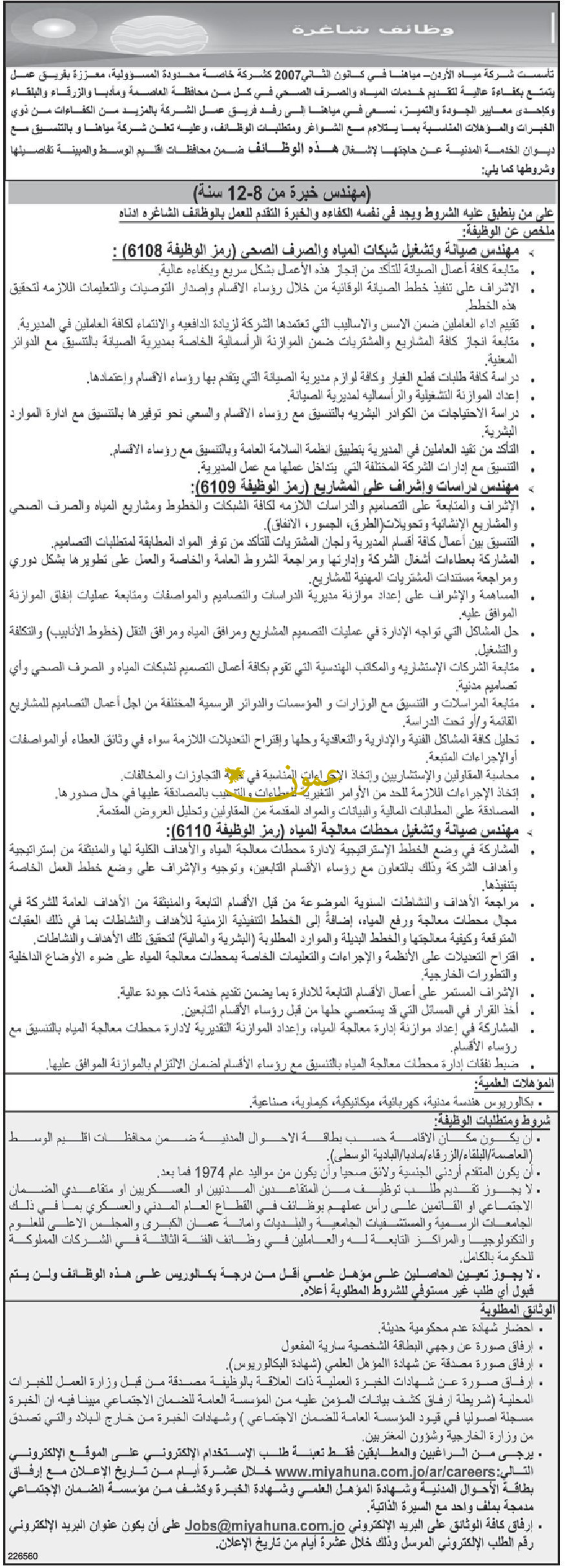 عمون - أعلنت شركة مياه الأردن - مياهنا بالتنسيق مع ديوان الخدمة المدنية عن حاجتها لإشغال وظائف ضمن محافظات إقليم الوسط. |