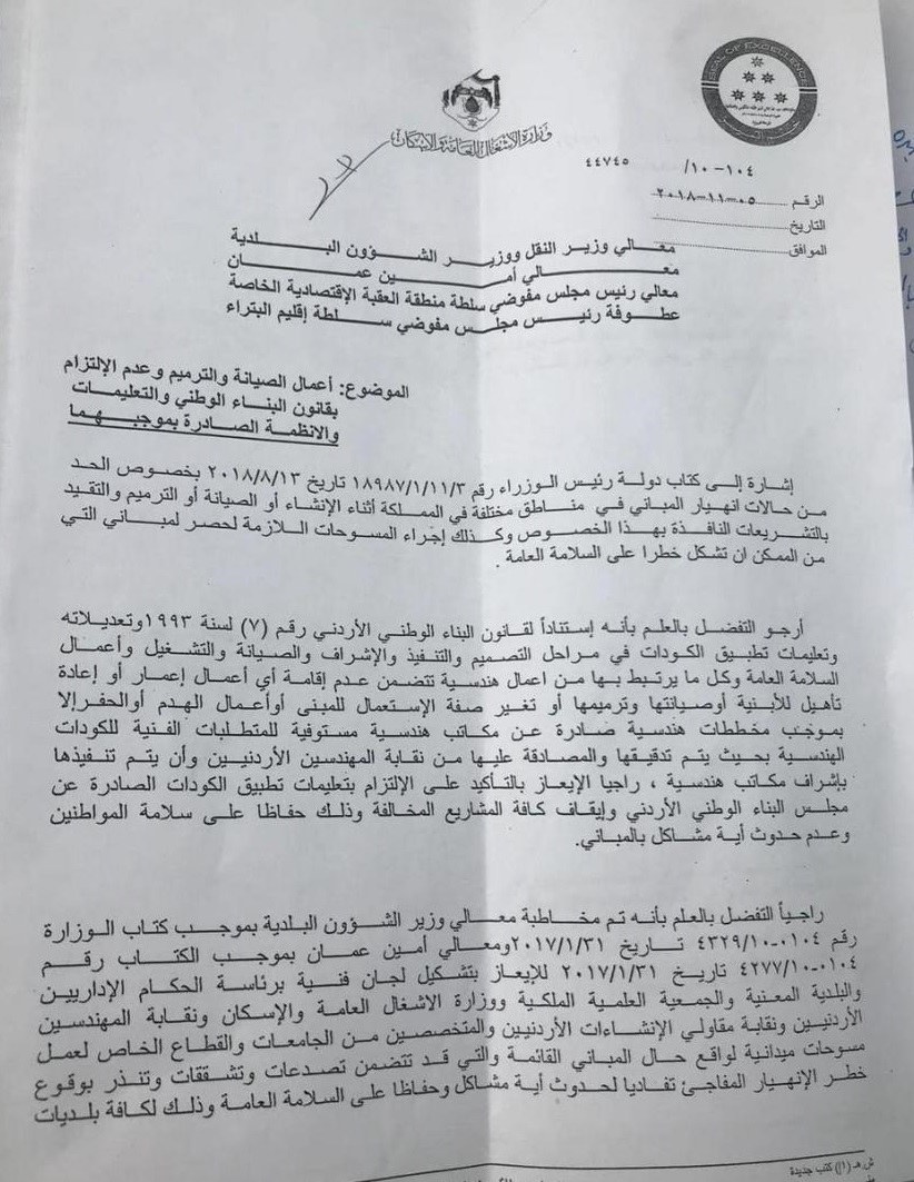 وبحسب الوثيقة، فإن مجلس البناء الوطني الذي يرأسه وزير الأشغال العامة والإسكان، وجّه كتابا إلى أمين عمان وغيره من الجهات الرسمية قبل حوالي (٤) سنوات، بخصوص الاجراءات الواجب اتخاذها إزاء الأبنية القديمة، وضرورة الكشف عليها للتحقق من متانتها أو عدم اجراء أي أعمال صيانة فيها دون مخططات هندسية أو اشراف هندسي، مع التقيد بالكودات الهندسية.