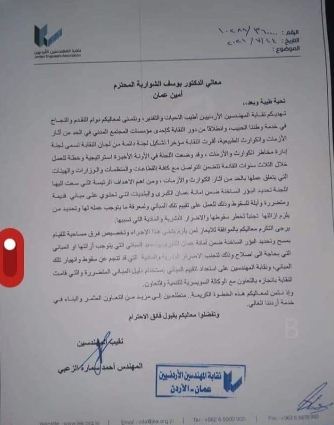 نقيب المهندسين الأردنيين أحمد سمارة الزعبي، قال إن نقابة المهندسين سبق أن خاطبت أمانة عمان الكبرى وجميع البلديات بخصوص اجراء مسح للمناطق الخطرة التي قد تكون معرضة للانهيارات، لكن النقابة لم تتلق أي رد من تلك الجهات.