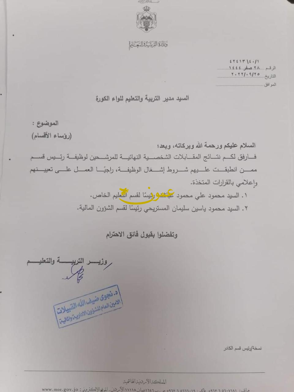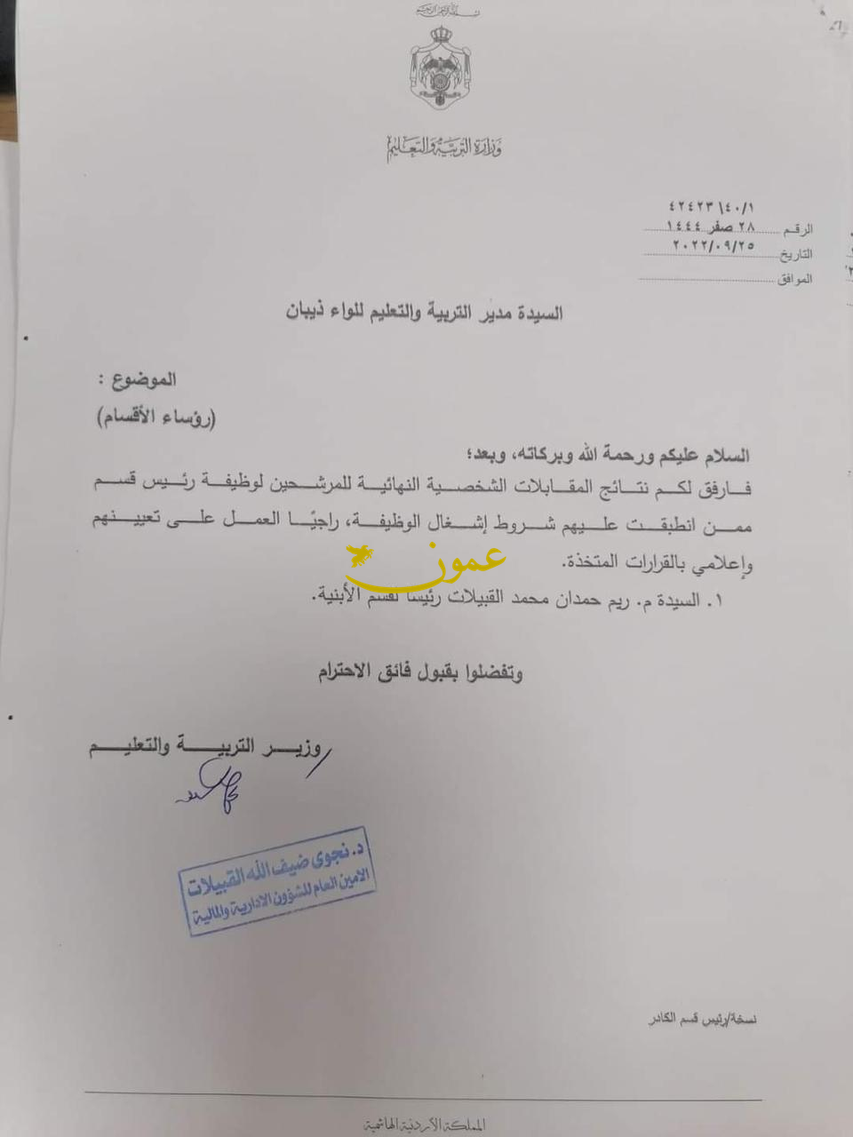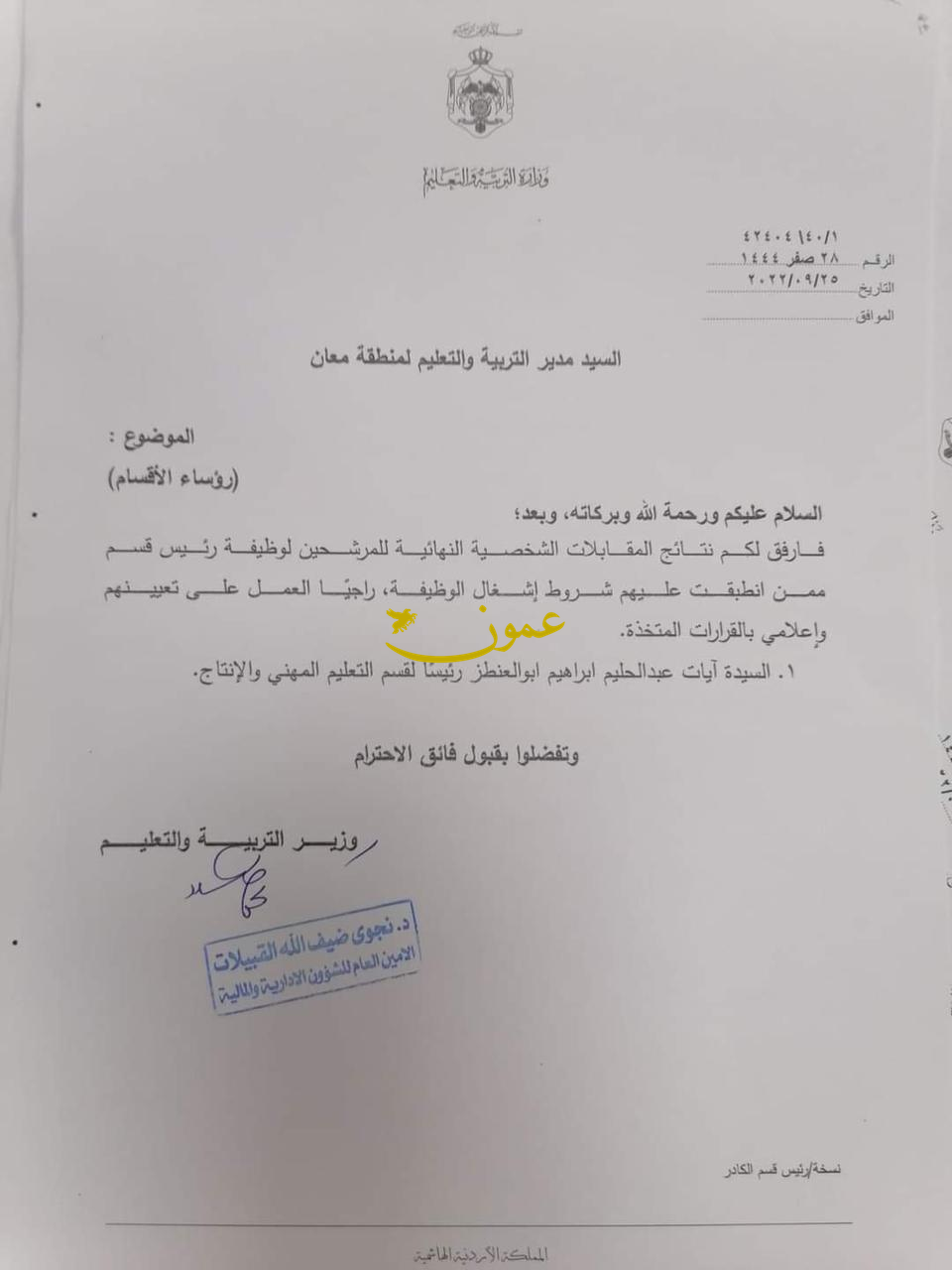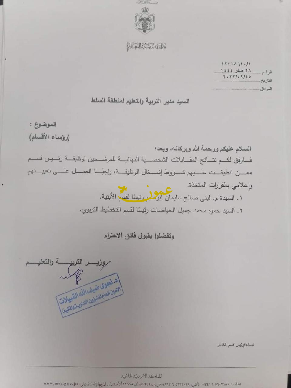 عمون - ينال المعاني - أعلنت وزارة التربية والتعليم نتائج المقابلات الشخصية النهائية لوظيفة رئيس قسم ممن انطبقت عليهم شروط اشغال الوظيفة. |