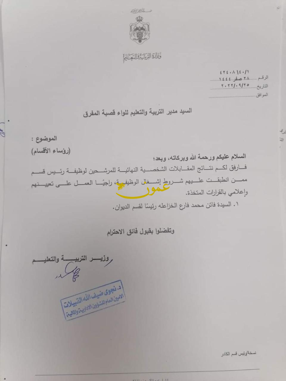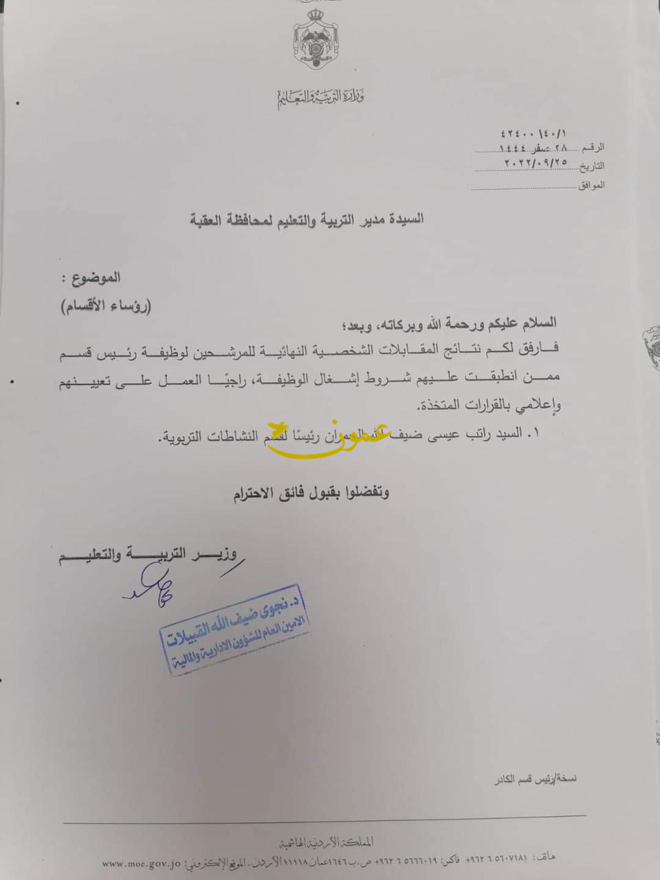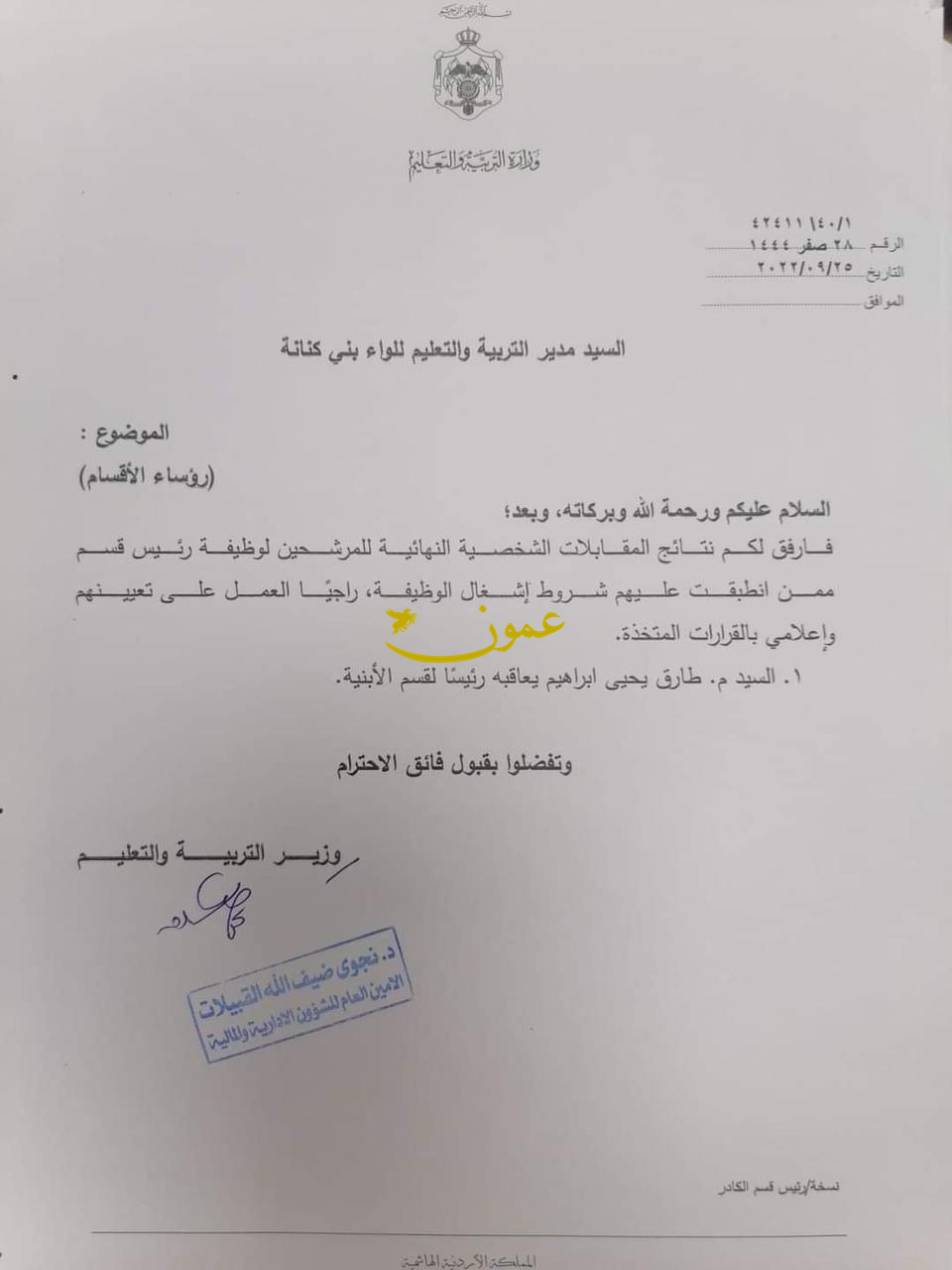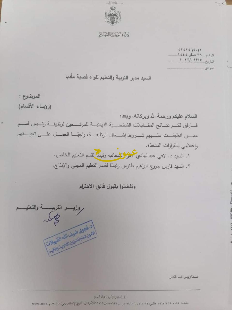 عمون - ينال المعاني - أعلنت وزارة التربية والتعليم نتائج المقابلات الشخصية النهائية لوظيفة رئيس قسم ممن انطبقت عليهم شروط اشغال الوظيفة. |