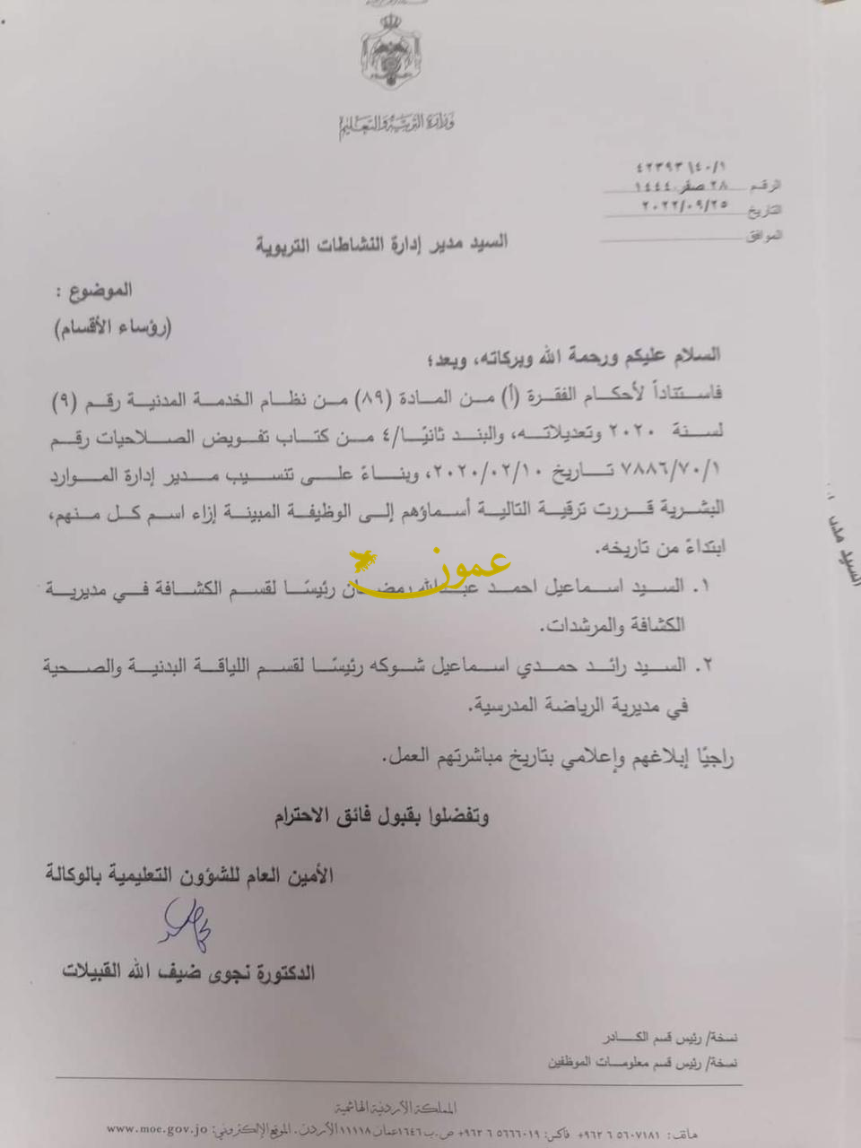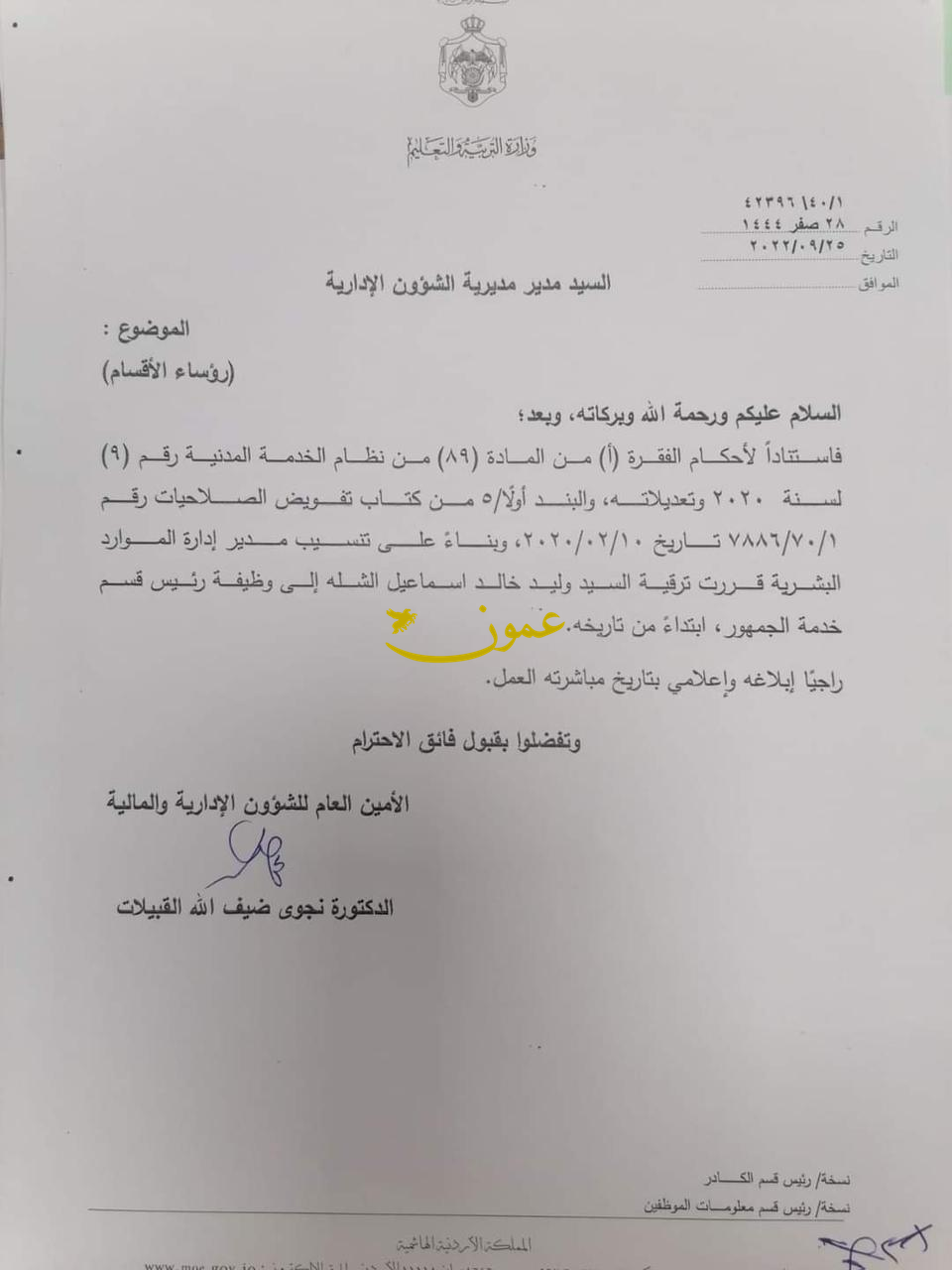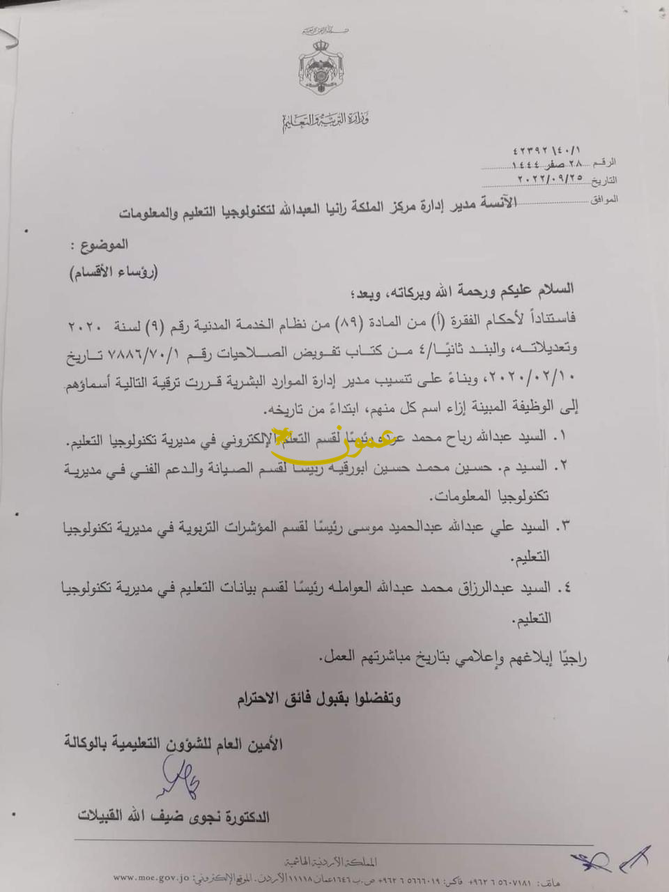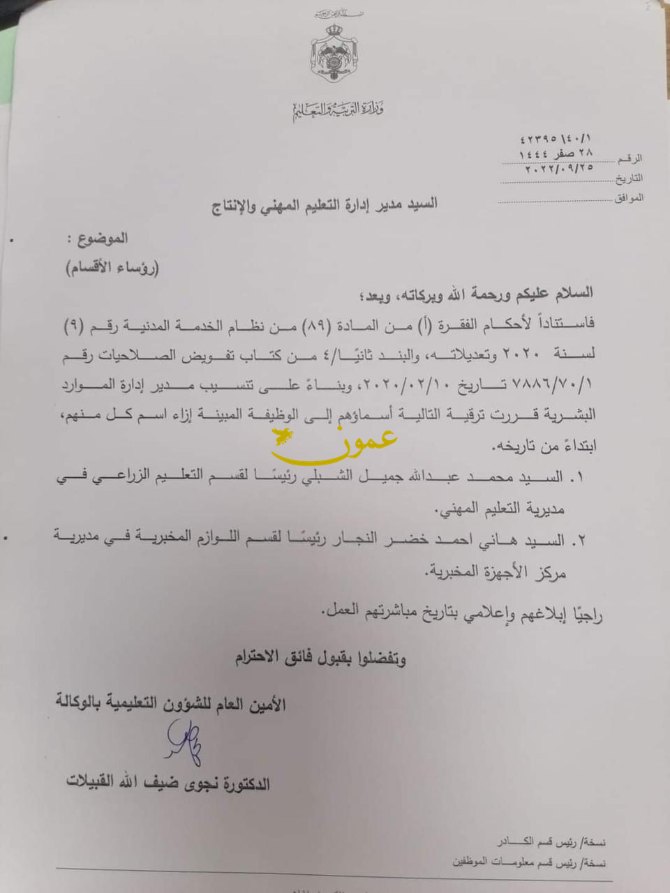 عمون - ينال المعاني - أعلنت وزارة التربية والتعليم نتائج المقابلات الشخصية النهائية لوظيفة رئيس قسم ممن انطبقت عليهم شروط اشغال الوظيفة. |