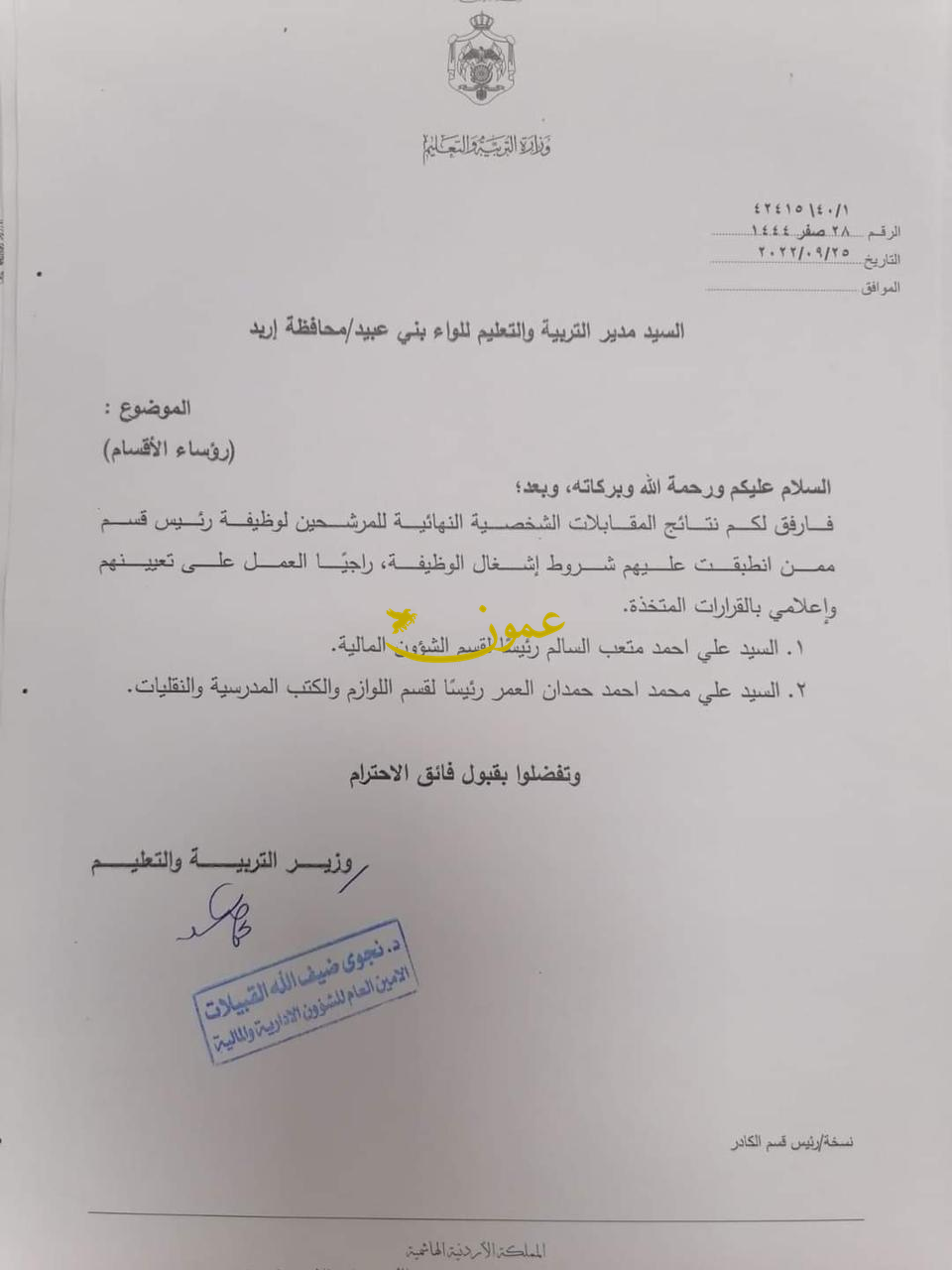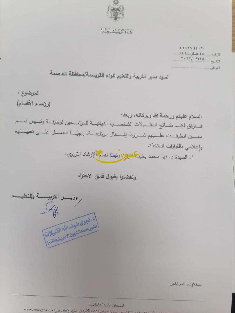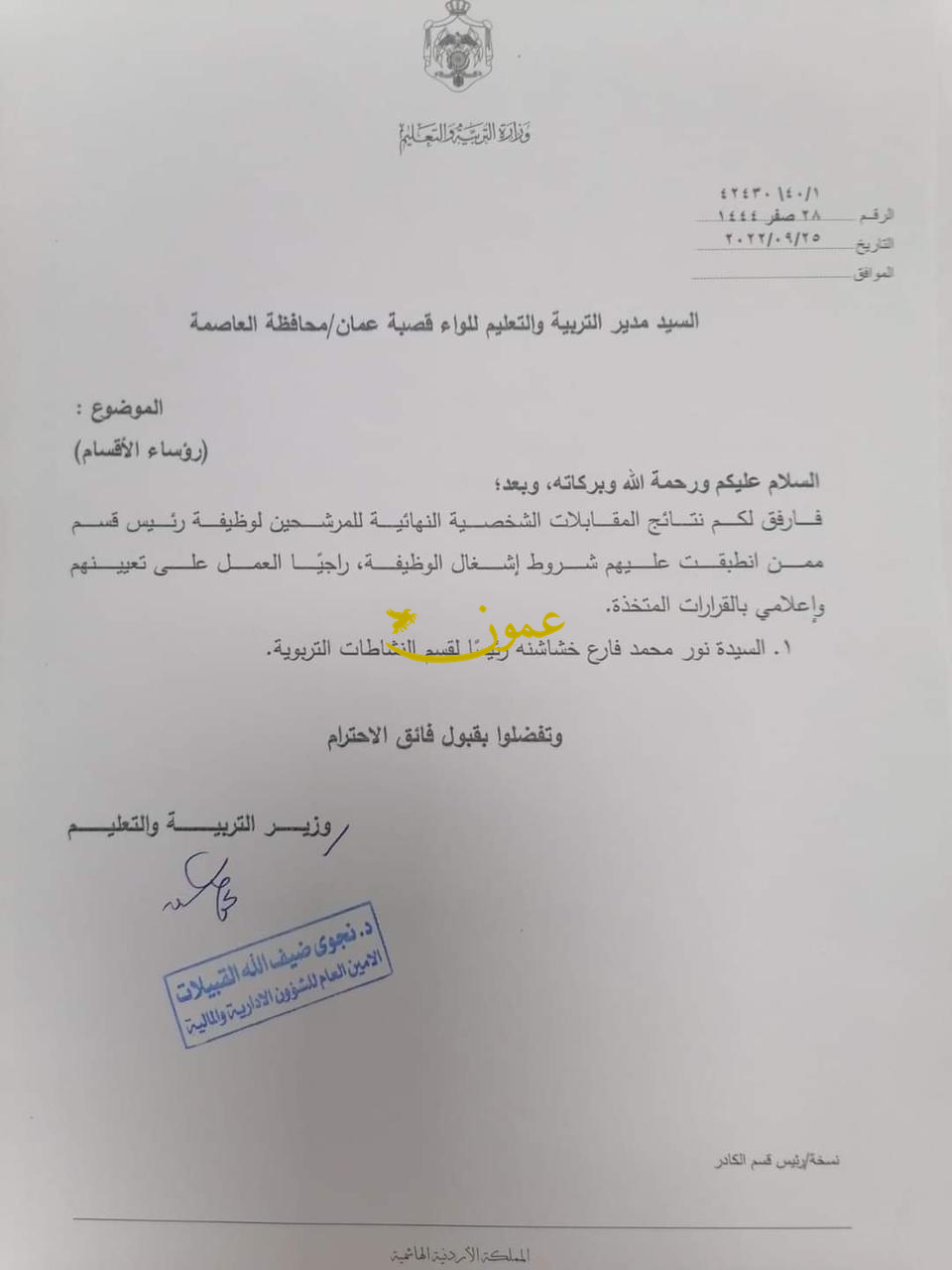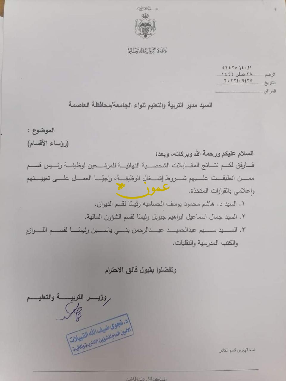 التربية تعلن نتائج المقابلات الشخصية لوظيفة رئيس قسم (أسماء)26-09-2022 04:30 PM