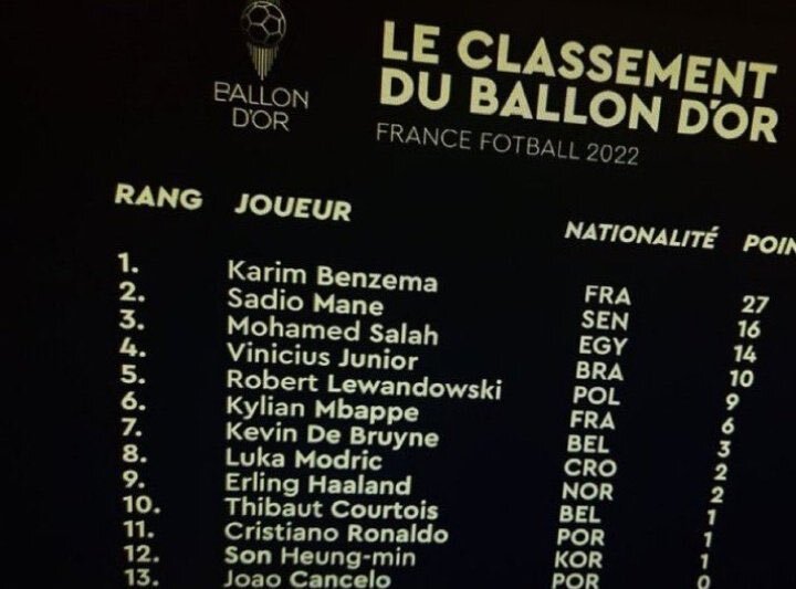 ونشر موقع مجلة "Sports Illustrated" الأمريكية صورة مسربة لترتيب اللاعبين المرشحين للفوز بالكرة الذهبية 2022 بعد اكتمال التصويت، وجاء كريم بنزيما في الصدارة بحصوله على 27 نقطة.