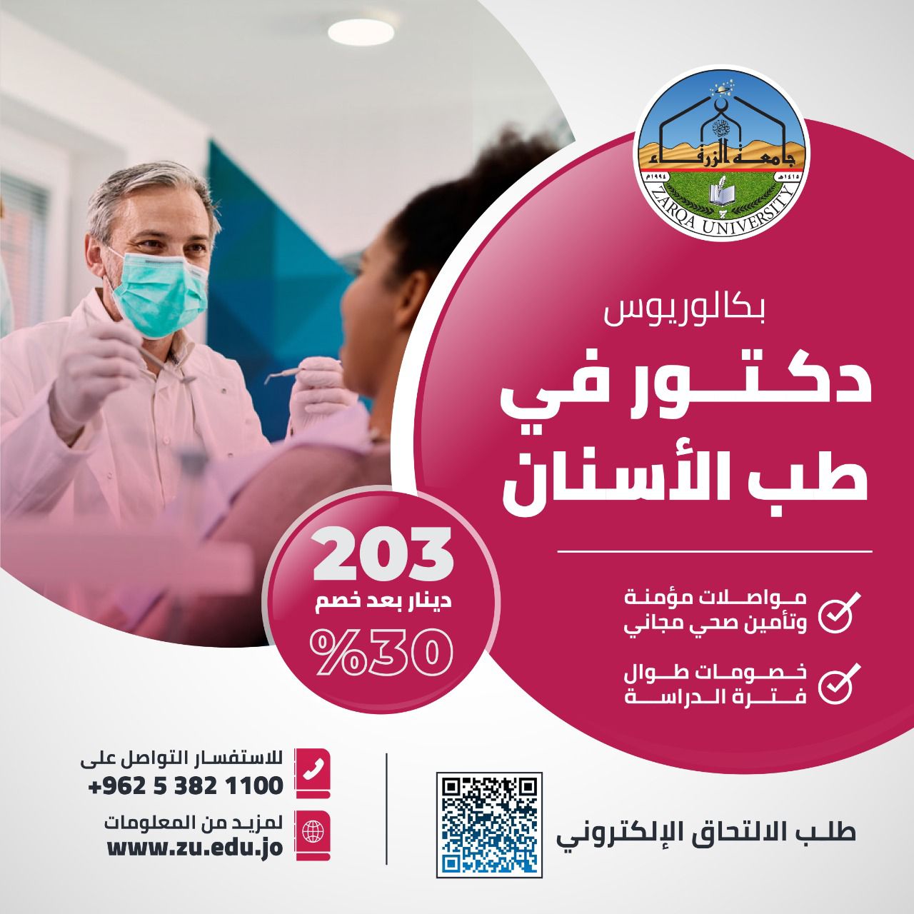 عمون - اعلنت جامعة الزرقاء عن منح الطلبة المسجلين او الراغبين بالالتحاق في كلية طب الاسنان (تخصص دكتور في طب الأسنان) خصما تشجيعيا على رسوم الساعات الدراسية بنسبة 30 بالمئة للعام الجامعي ٢٠٢٢.
