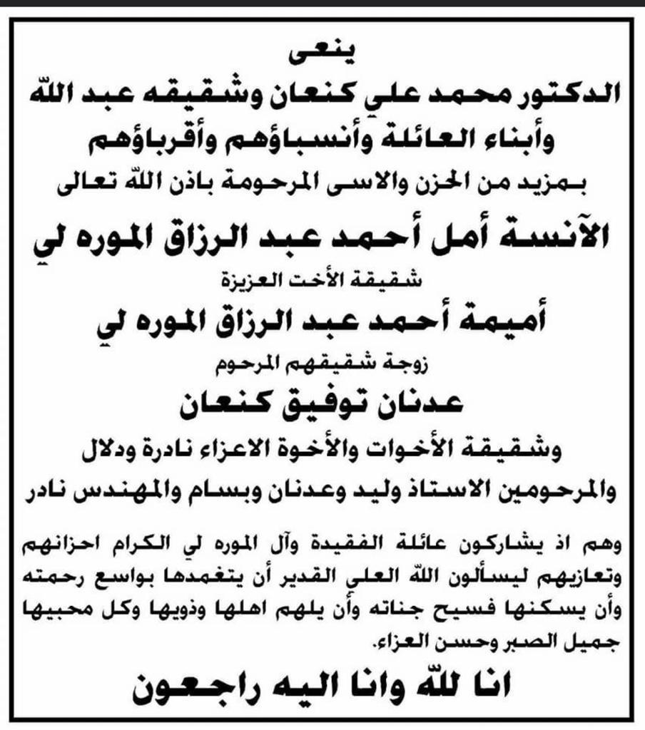 عمون - ينعى محمد علي كنعان وشقيقه عبد الله وأبناء العائلة وأنسباؤهم وأقرباؤهم، بمزيد من الحزن والأسى، المرحومة بإذن الله تعالى، الآنسة أمل أحمد عبد الرزاق الموره لي، شقيقة أميمة أحمد عبد الرزاق الموره لي، زوجة شقيقهم المرحوم عدنان توفيق كنعان، وشقيقة الأخوات والأخوة الأعزاء نادرة ودلال والمرحومين الأستاذ وليد وعدنان، وبسام والمهندس نادر. |