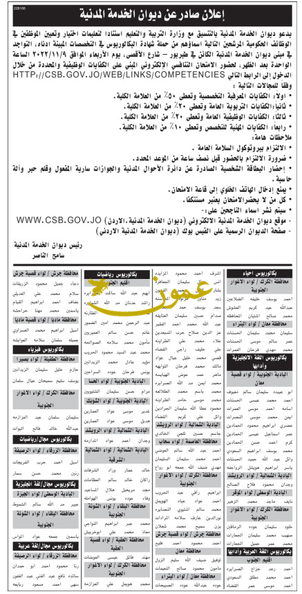 عمون - دعا ديوان الخدمة المدنية، بالتنسيق مع وزارة التربية والتعليم التالية أسماؤهم من حملة شهادة البكالوريوس التواجد في مبنى الديوان الكائن في طبربور يوم الأربعاء (9-11-2022) الساعة الواحدة بعد الظهر لحضور الامتحان التنافسي. |