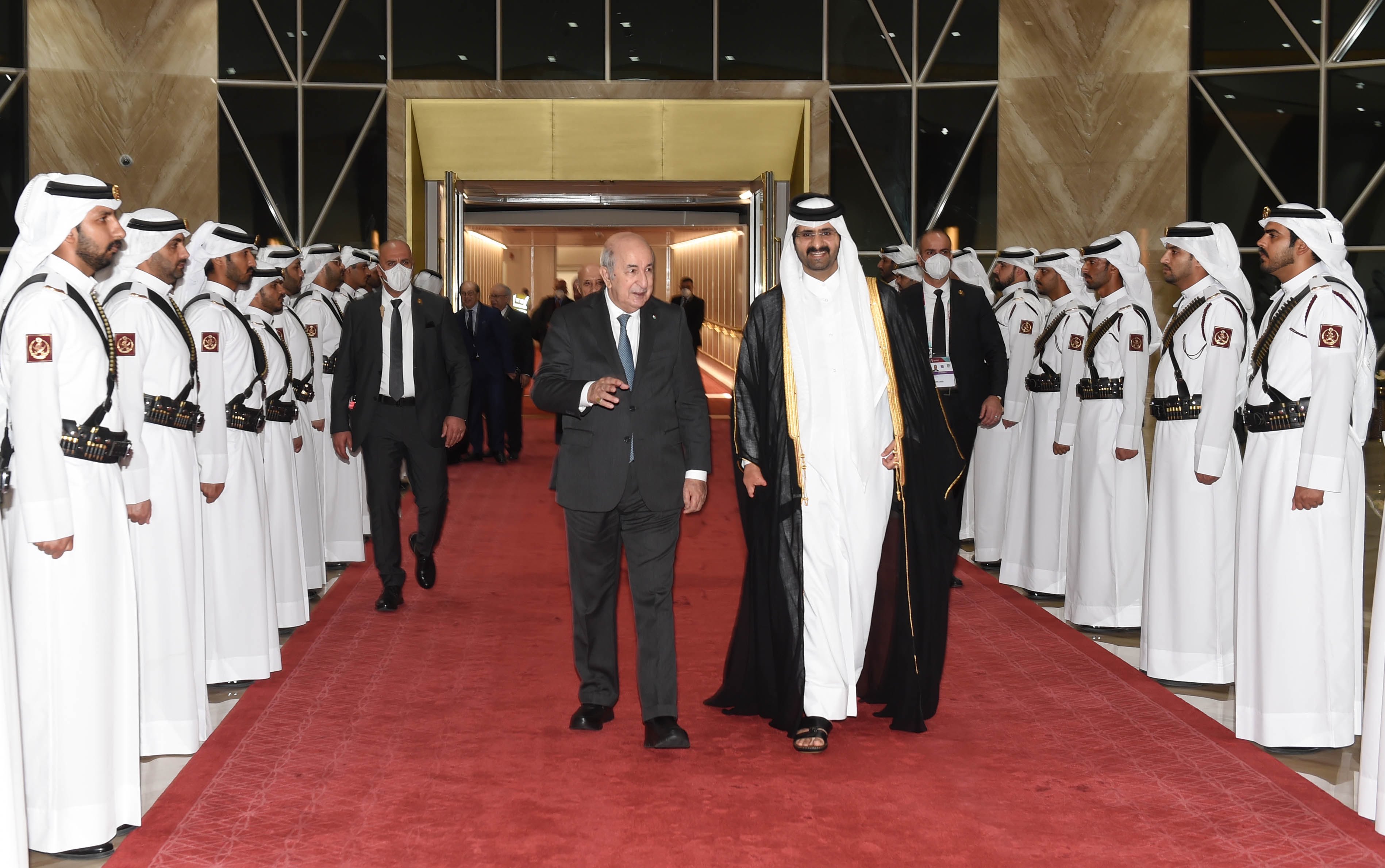 واستقبل نائب أمير قطر سمو الشيخ عبدالله بن حمد آل ثاني الرئيس الجزائري، عبدالمجيد تبون، لدى لدى وصوله والوفد المرافق إلى الدوحة لحضور حفل افتتاح بطولة كأس العالم FIFA قطر 2022.