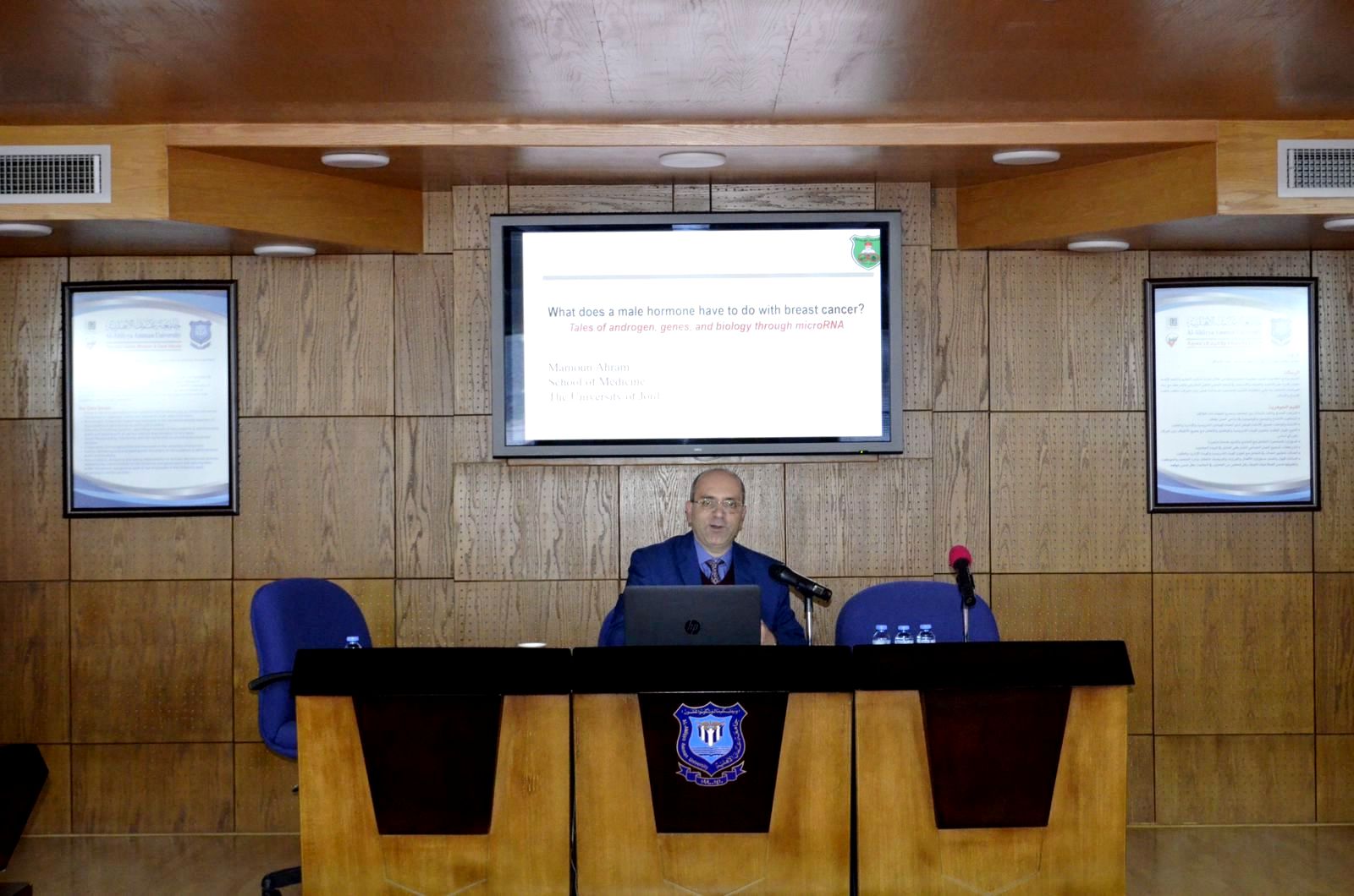 حيث ألقي محاضرة علمية شيقة على مسامع الحضور، عن مساره البحثي، وعن أحدث نتائج الدراسات العلمية التي توصل لها هو وفرقه البحثية، في مجال علوم السرطانات الجزيئية، حيث ناقش تأثيرات الهرمونات الذكرية على سرطانات الثدي
