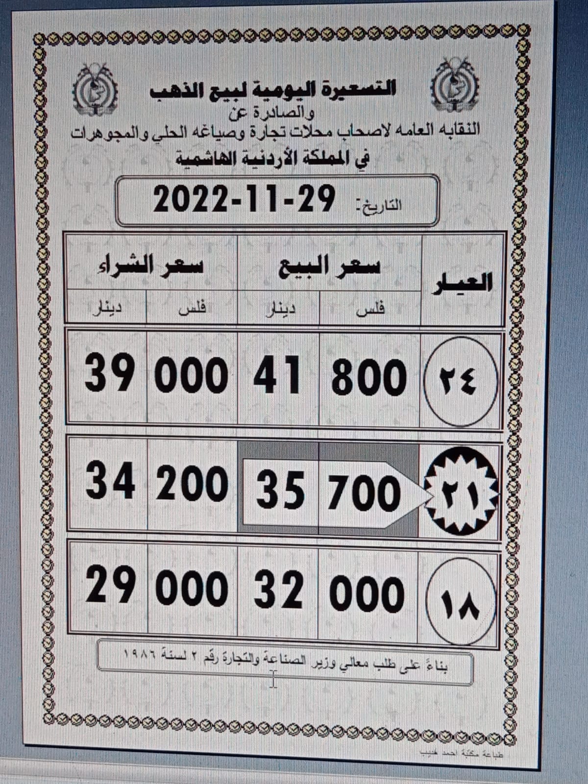 أسعار الذهب محليا الثلاثاء29-11-2022 10:18 AM