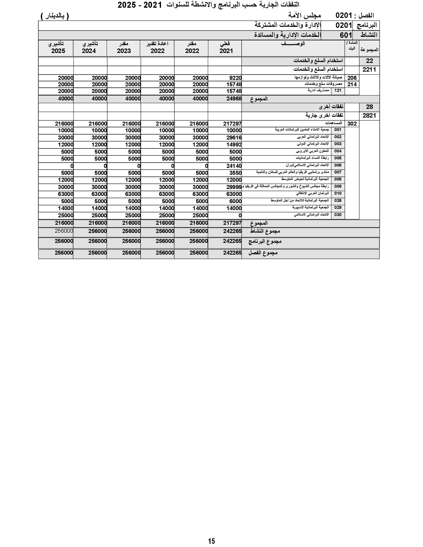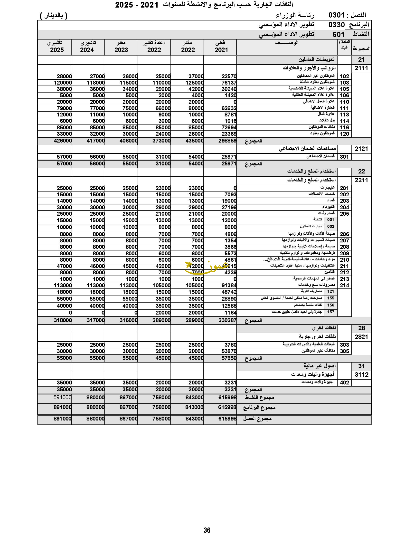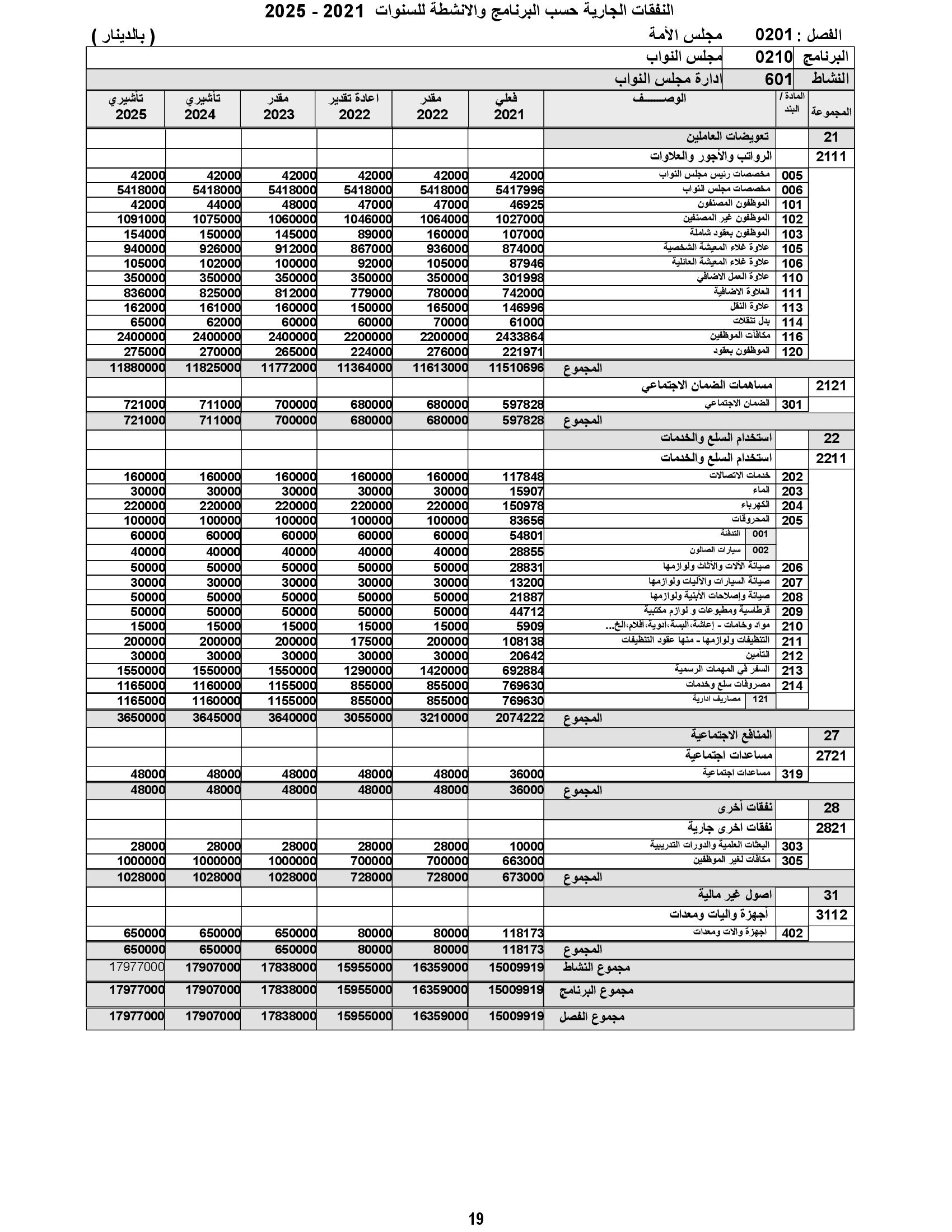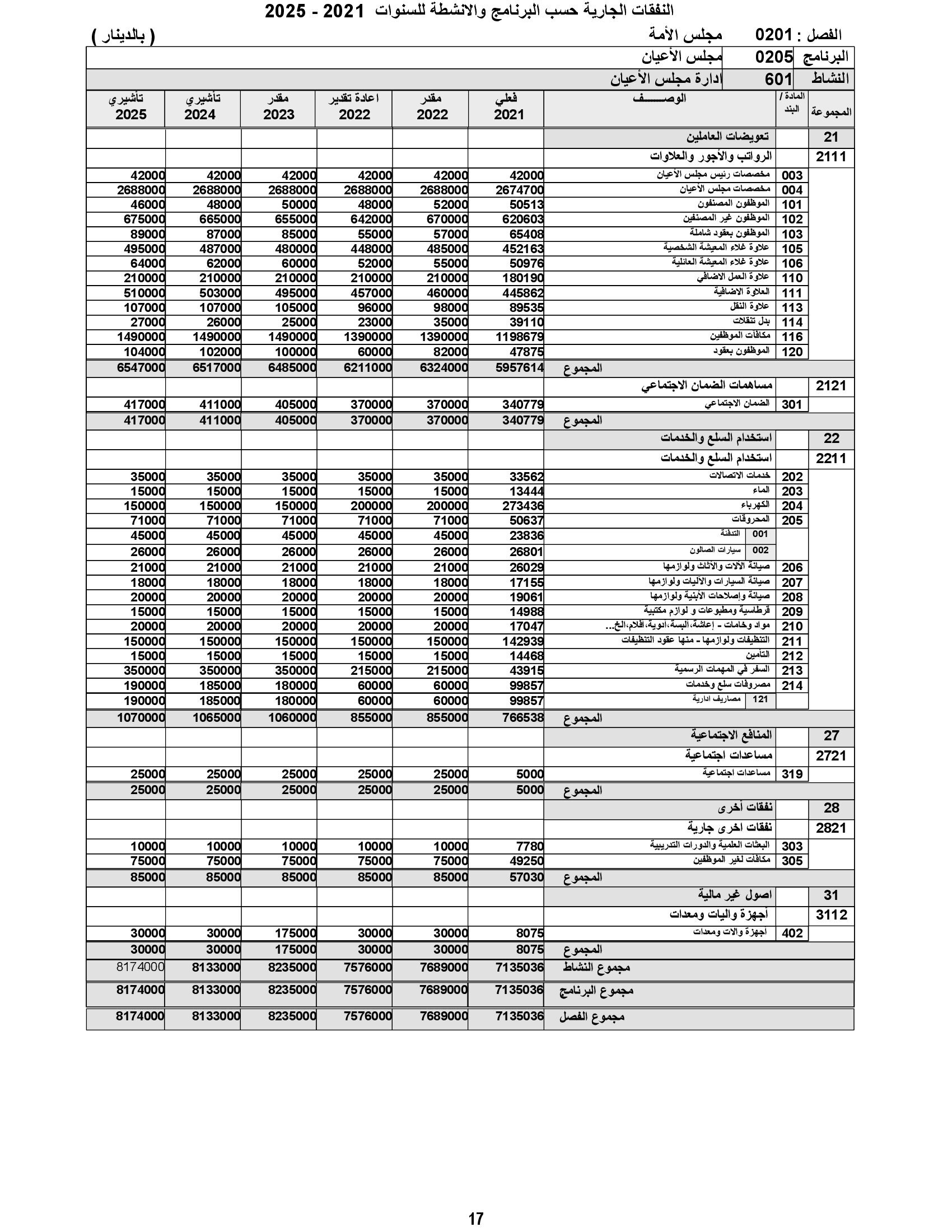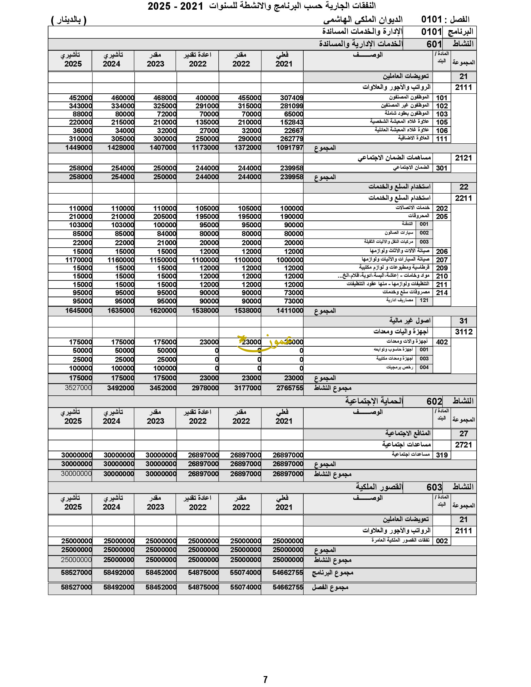 وعن النفقات الجارية، أوضح أنه زادت مجموعة التعويضات العاملين بمبلغ 240 ألف دينار وذلك لتغطية الزيادة الطبيعية للرواتب، وكلفة تعبئة عدد من الوظائف الشاغرة، وزادت مجموعة النفقات التشغيلية بمبلغ 82 ألف دينار وذلك لتغطية كلف الزيادة التي تركزت في بنود المحروقات وخدمات الاتصالات وصيانة السيارات والآليات، بالإضافة إلى زيادة مجموعة النفقات الأخرى بقيمة 3255 ألف دينار لتغطية زيادة بند المساعدات الاجتماعية اللازمة لتمكين الديوان من تنفيذ المبادرات الملكية السامية.