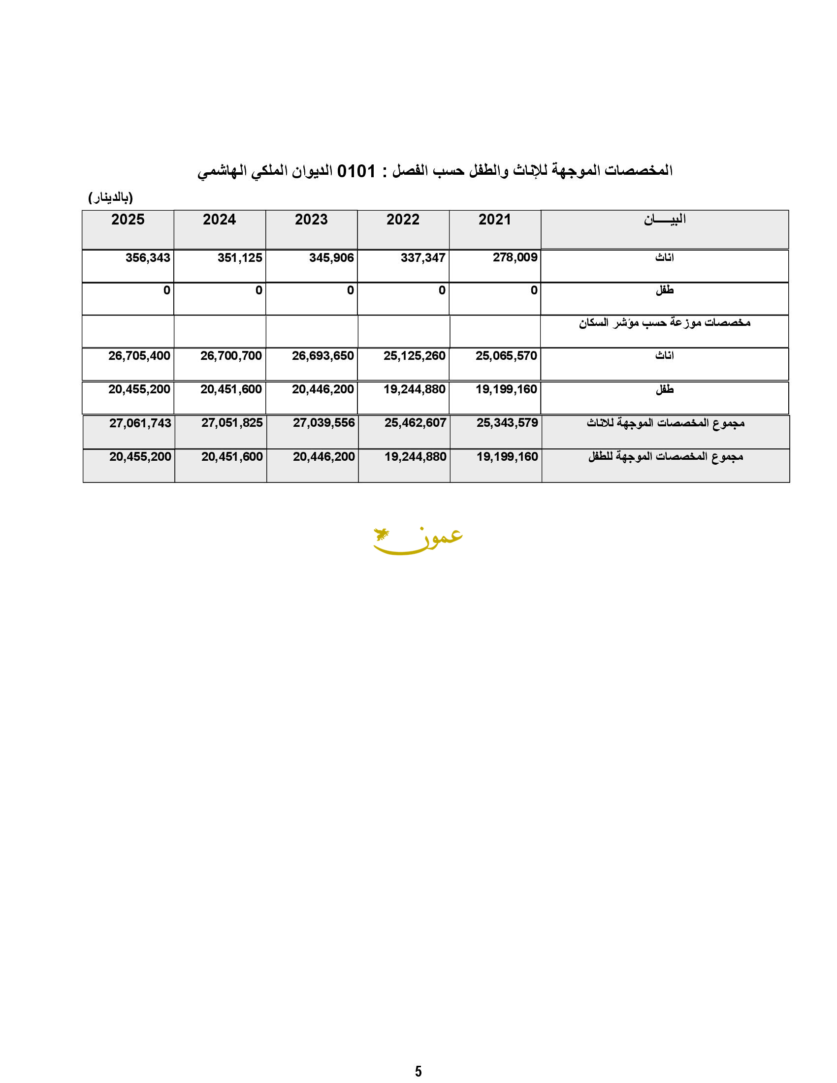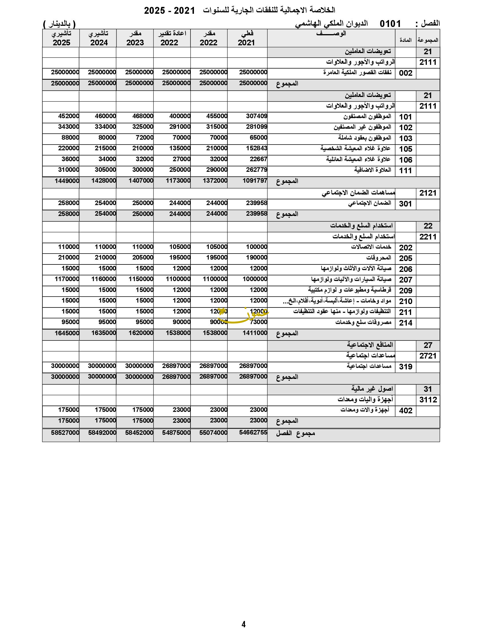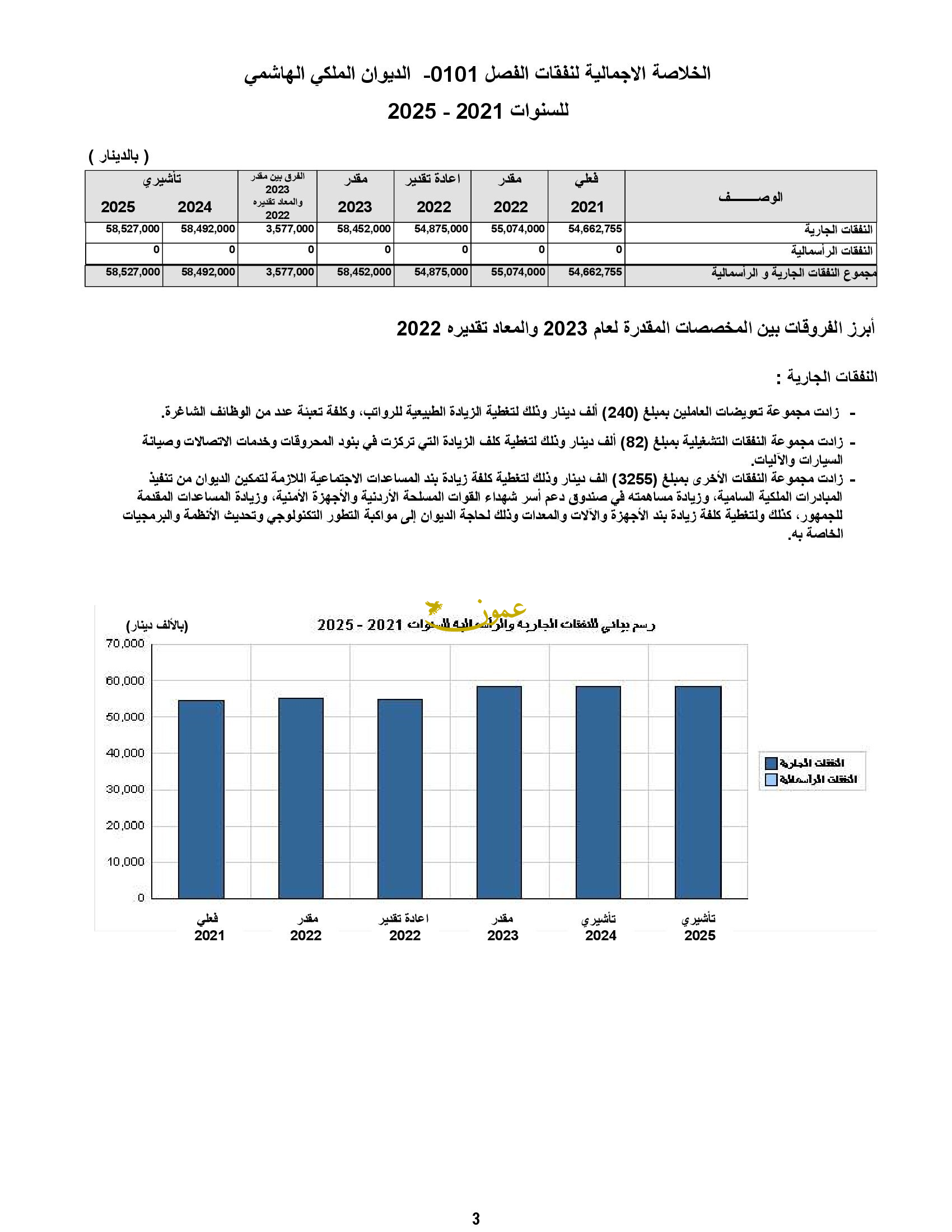 وقال المشروع، الذي اطلعت عليه عمون، إن الموازنة للديوان خلال العام الحالي كانت 55 مليون دينار، فيما كانت تحت بند إعادة تقدير 54.8 مليون دينار.