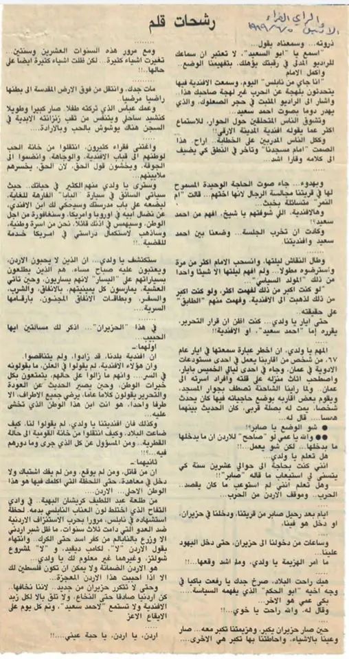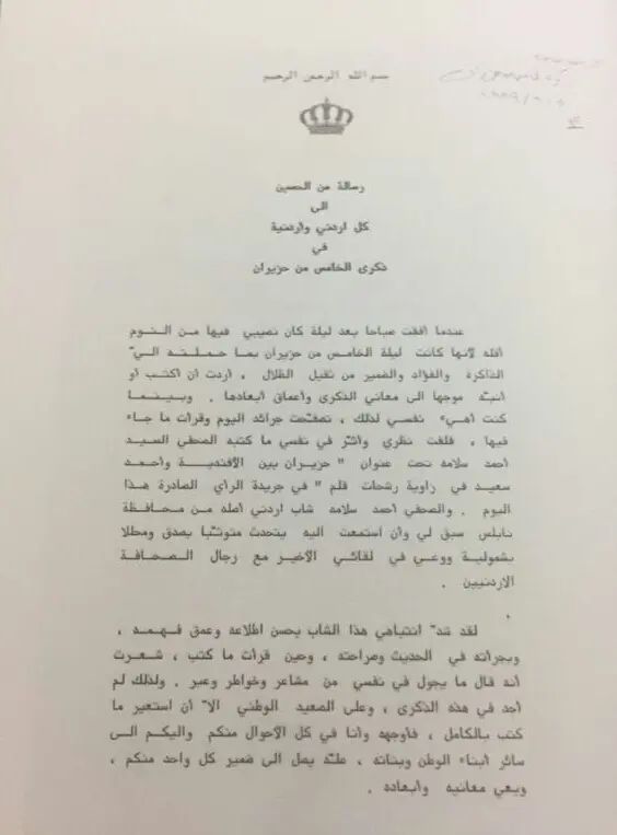 عمون - بعث الزميل الأستاذ ناصر قمش الباحث في مركز دراسات البحرين مقالا حول الزمن الجميل الذي كانت الصحافة المطبوعة فيه اداة الفعل الوطني مما حدا بالمغفور له الراحل العظيم الباني الحسين بن طلال طيب الله ثراه ان يرسل رسالة تاريخية للكاتب الاردني احمد سلامة ولصحيفة الراي هذه تفاصيلها كما رواها الزميل قمش: