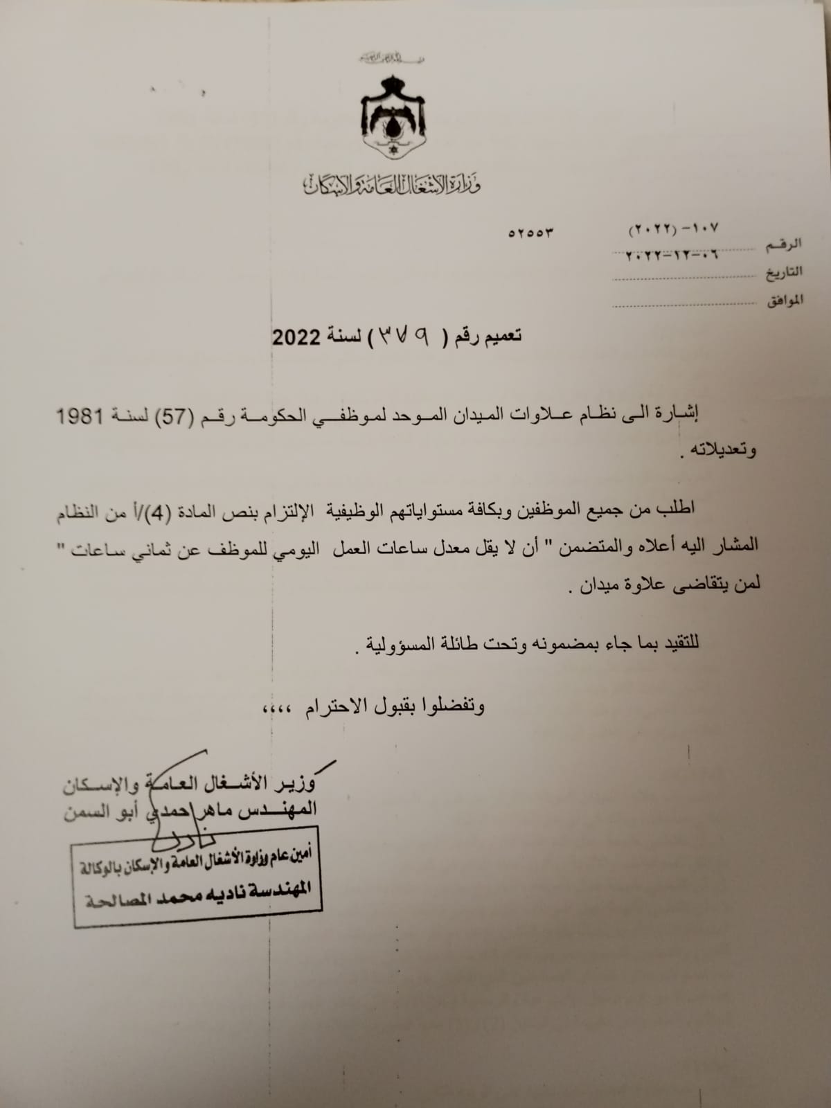 عمون - شكا موظفون في وزارة الأشغال العامة والإسكان، من قرار الغاء علاوة الميدان والبالغ قيمتها 48 دينارا، والتي يتقاضونها منذ نحو 10 سنوات.
