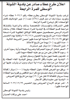 مطلوب شراء سيارة بك اب دبل كابين "4×4"لبلدية الشونة الوسطى