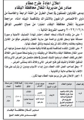 مطلوب تعبيد عدة طرق لمديرية اشغال محافظة البلقاء