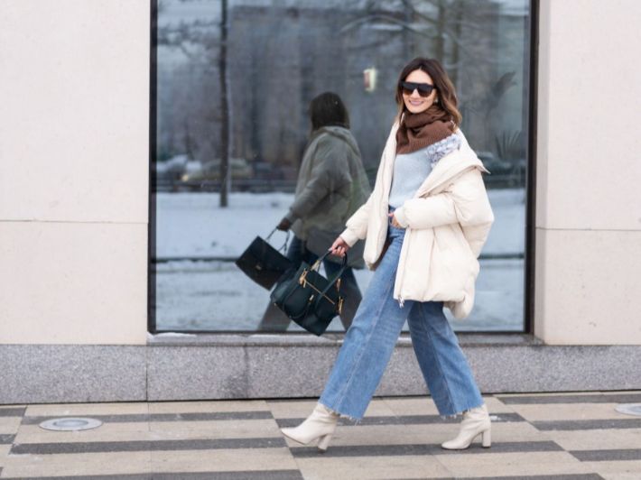 يمكنك تجربة الجينز الواسع على جاكيت طويل ومفتوح للحصول على إطلالة شتوية مميزة. يمكنك ارتداء الجاكيت بالكامل أو وضعه على كتفيك فقط. يمكنك تنسيقه مع بلوزة سوداء وجاكيت طويل أسود مفتوح، أو مع جاكيت أخضر زيتي وقطعة علوية بدرجات البيج.