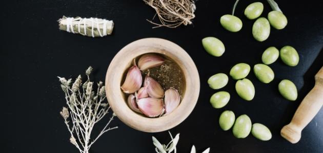 تدليك فروة الرأس بفص ثوم وتدليكه جيدًا، ثم توزيع زيت الزيتون على الشعر وتغطيته، ثم غسله في اليوم التالي.