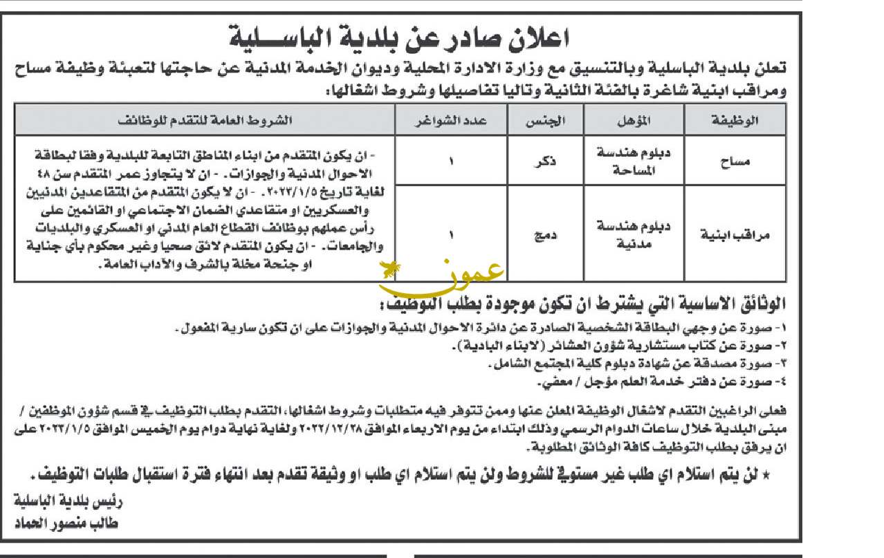 كما أعلنت بلدية الباسلية، وبالتنسيق مع وزارة الإدارة المحلية وديوان الخدمة المدنية عن حاجتها لتعبئة وظائف شاغرة بالفئة الثانية (مساح، ومراقب أبنية).