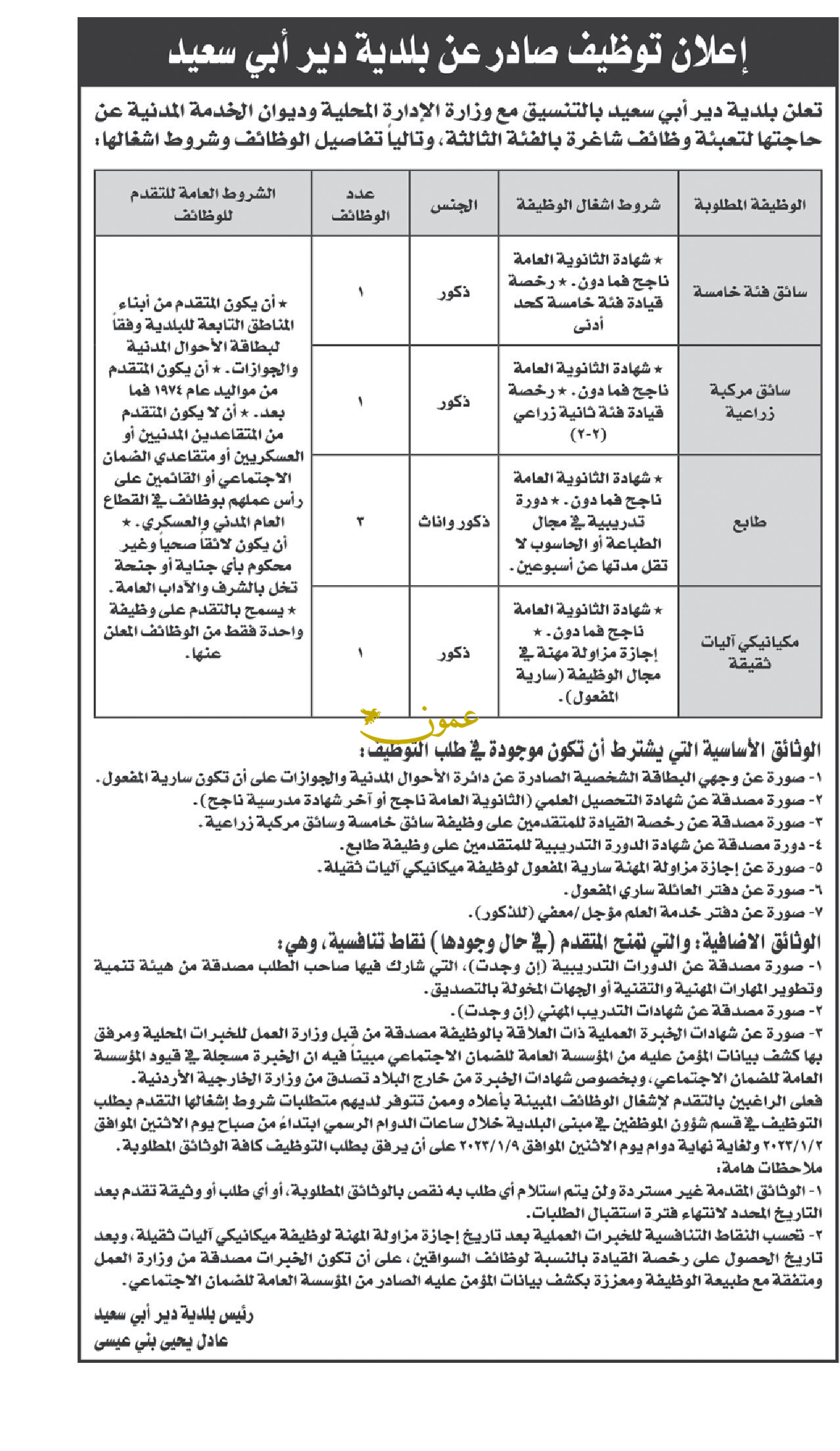 وفي سياق منفصل، أعلنت بلدية دير أبي سعيد بالتنسيق مع وزارة الإدارة المحلية وديوان الخدمة المدنية عن حاجتها لتعبئة وظائف شاغرة بالفئة الثالثة (سائق فئة خامسة، سائق مركبة زراعية، طابع عدد3، وميكانيكي آليات ثقيلة).