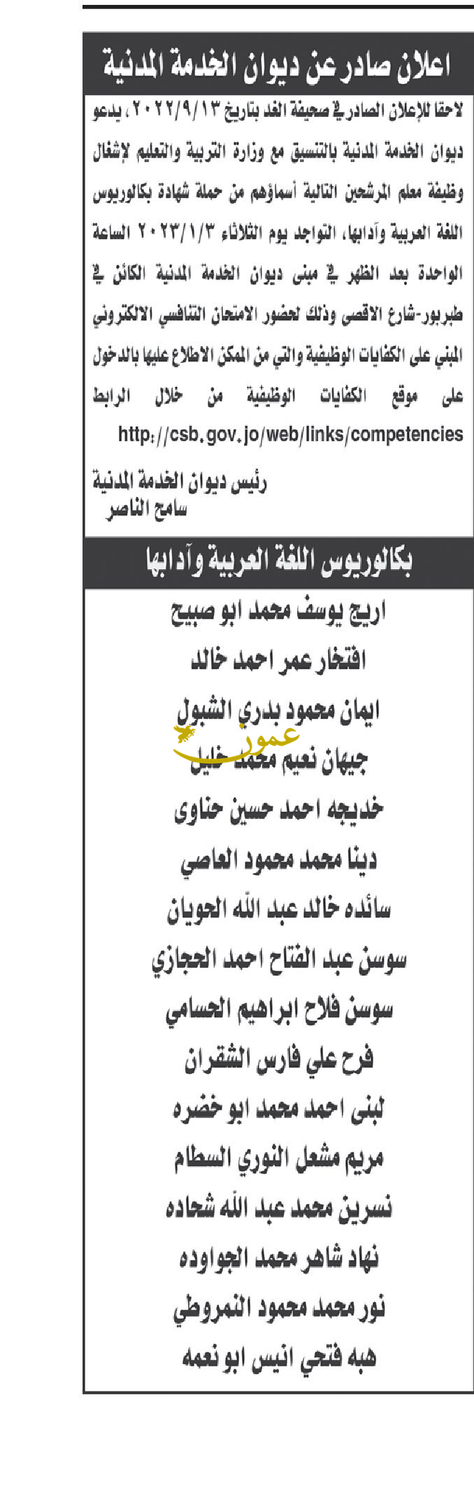 عمون - دعا ديوان الخدمة المدنية بالتنسيق مع وزارة التربية والتعليم، عدد من المرشحين ادناه من حملة بكالوريوس اللغة العربية وآدابها، لحضور الامتحان التنافسي.