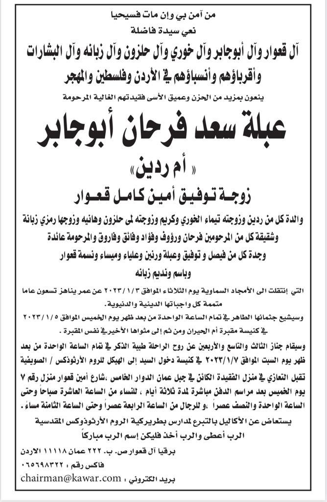 تقبل التعازي في منزل الفقيدة الكائن في جبل عمان الدوار الخامس ،شارع أمين قعوار منزل رقم 7 يوم الخميس بعد مراسم الدفن مباشرة لمدة ثلاثة أيام ، للنساء من الساعة العاشرة صباحا و حتى الساعة الواحدة و النصف عصرا ،و للرجال من الساعة الرابعة عصرا و حتى الساعة الثامنة مساء.