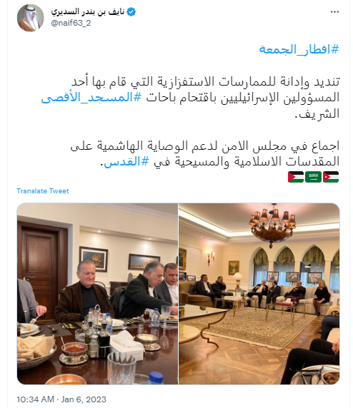 وقال السديري في تغريدة له عبر تويتر، "افطار الجمعة. تنديد وإدانة للممارسات الاستفزازية التي قام بها أحد المسؤولين الإسرائيليين باقتحام باحات المسجد الأقصى الشريف. اجماع في مجلس الامن لدعم الوصاية الهاشمية على المقدسات الاسلامية والمسيحية في القدس".