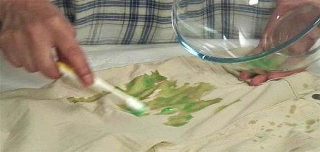 فرك البقعة لمدة 30 دقيقة واتركها طوال الليل، ثم غسلها بالماء الدافئ مع المنظفات. قد تحتاج إلى تكرار الخطوات إذا استمرت البقعة.