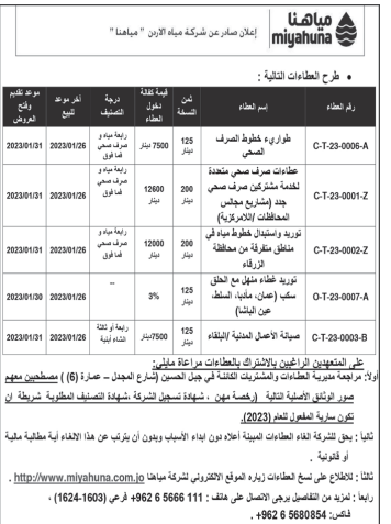 عطاءات صادرة عن شركة مياه الاردن "مياهنا"