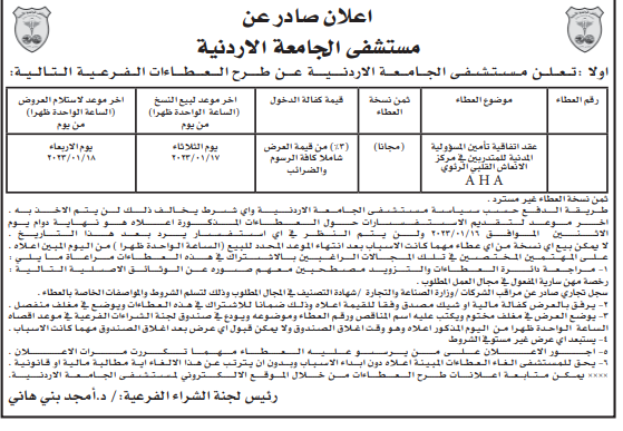 عطاء صادر عن مستشفى الجامعة الاردنية