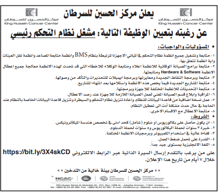 وظيفة شاغرة لدى مركز الحسين للسرطان