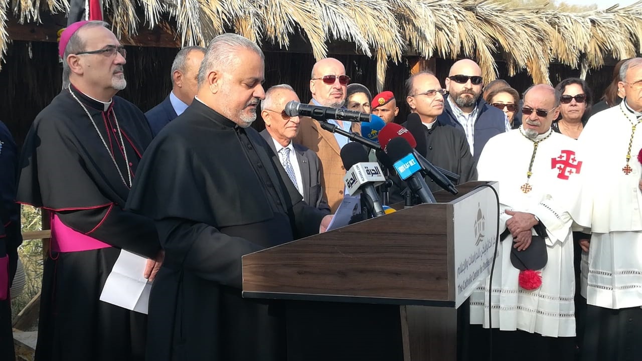 بطريرك القدس للاتين بييرباتيستا بيتسابالا قال في كلمته: "إننا نولي الاهتمام الكبير لهذا المكان المقدس (...) ولا ننسى بأن البابا بندكتس السادس عشر قد وقف هنا مع جلالة الملك عبدالله الثاني وجلالة الملكة رانيا العبدالله لوضع حجر الأساس لهذه الكنيسة في ١٠ أيار عام ۲۰۰۹ ونتذكر اليوم البابا بندكتس ونطلب له الرحمة بعد أن غادر هذه الحياة مع مطلع العام الجديد. لكن الكنيسة ما زالت لم تنته بعد، ونحن نطلب من الأصدقاء من كل مكان أن يساعدوا قدر الامكان في سبيل اتمام هذا العمل حيث ستكون تحفة فنية رائعة تحمل اسم معمودية السيد المسيح على الضفة الشرقية لنهر الأردن".