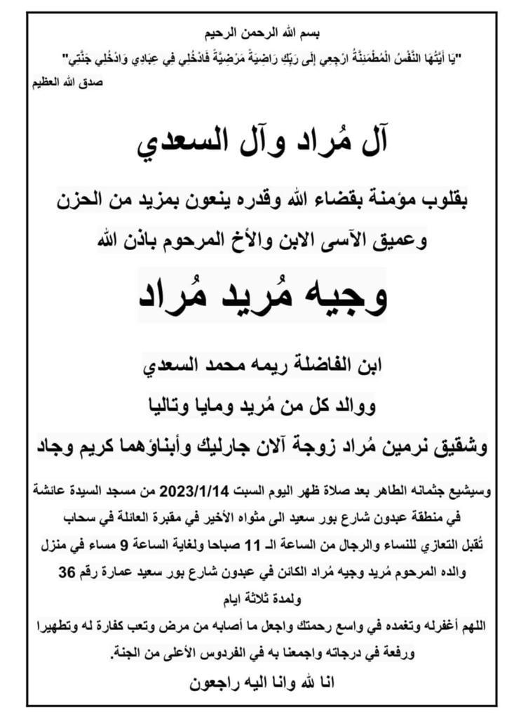 تقبل التعازي والمواساة للنساء والرجال من الساعة 11 صباحا ولغاية 9 مساء في منزل والده المرحوم مريد وجيه مراد الكائن في عبدون شارع بورسعيد عمارة رقم 36 ولمدة ثلاثة ايام.