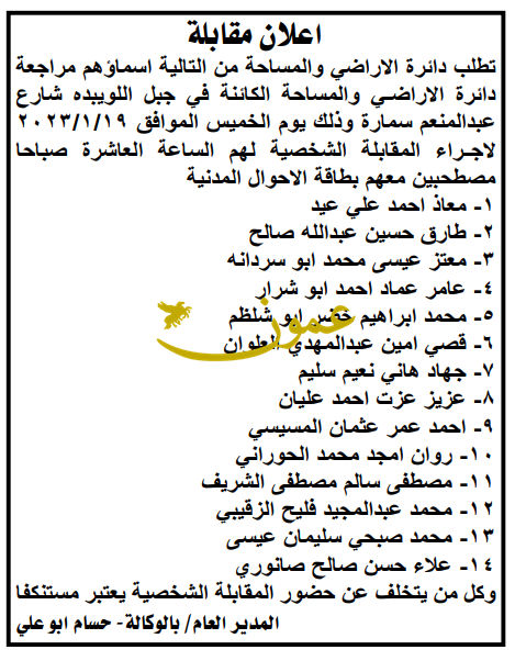 عمون - دعت دائرة الأراضي والمساحة التالية أسماؤهم مراجعتها يوم الخميس في تمام الساعة الساعة العاشرة صباحا المقبل لإجراء المقابلات الشخصية لغايات التعيين.