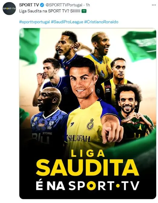 ونشرت الشبكة صورة تحتوي على نجوم الدوري السعودي يتصدرهم قائد المنتخب البرتغالي كريستيانو رونالدو معلّقة: الدوري السعودي في سبورت تي في.