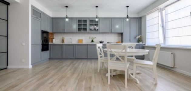 7. أرضيات خشبية: يعتبر الارضيات الخشبية خيارًا عصريًا وجميلًا يمزج بين القديم والحديث. إنها تعزز اللون السكني وتضيف لمسة ريفية وأناقة إلى المطبخ.