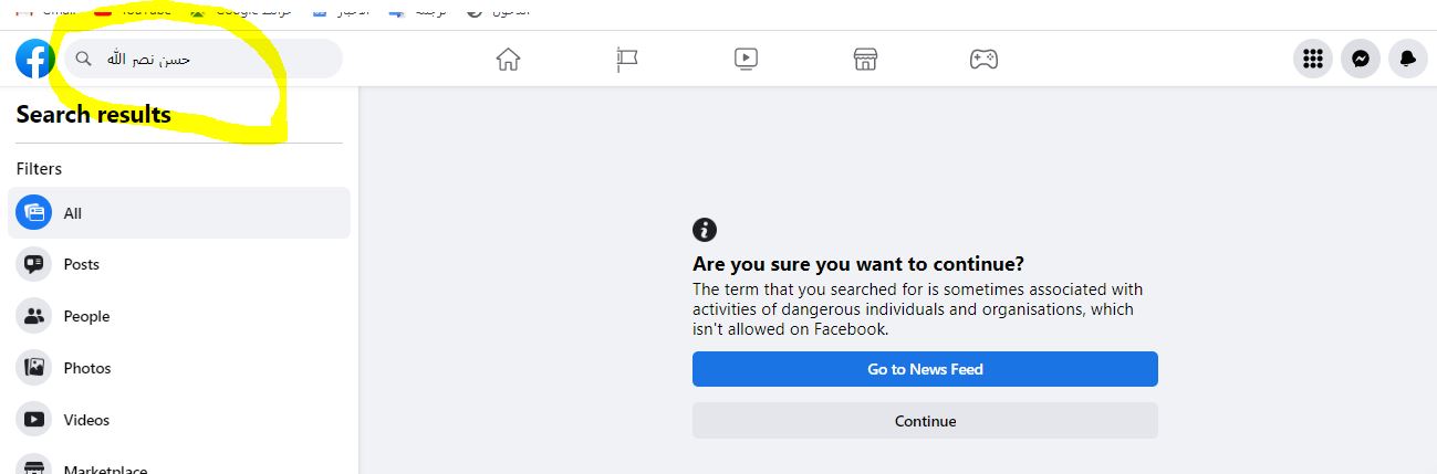 عمون - وضع موقع التواصل الاحتماعي "فيس بوك"، تحذيرًا عند محاولة البحث عن اسم حسن نصر الله زعيم حزب الله اللبناني، باعتبار أن اسمه من المصطلحات الذي بحثت عنه أحيانًا بأنشطة أفراد ومؤسسات خطرين. |
